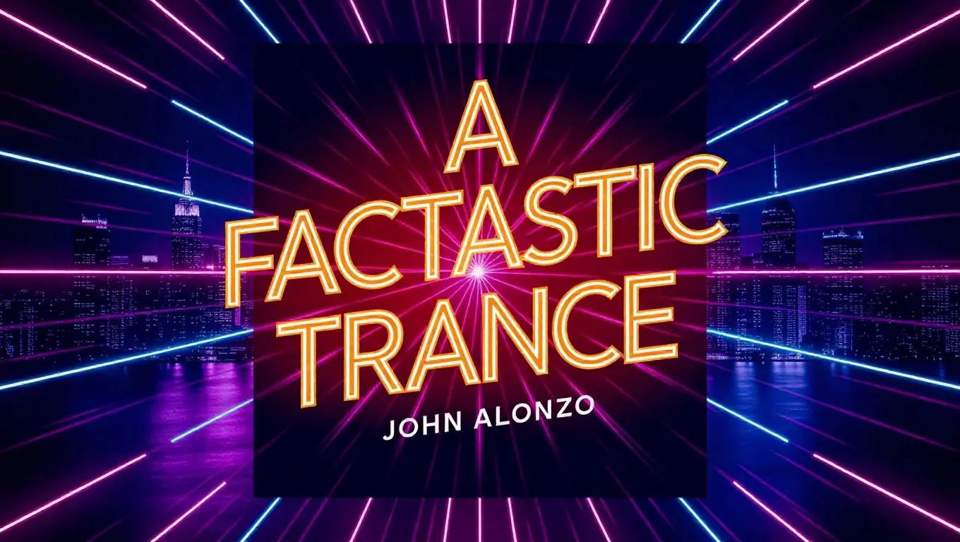 "A Fantastic Trance" by John Alonzo, displayed in vibrant neon text on a music album cover, with pulsing lights and dynamic visual effects. The background features a futuristic cityscape at night, illuminated by neon signs and glowing streaks of light, creating a high-energy, trance EDM atmosphere that maximizes engagement, views, virality, and earning potential.