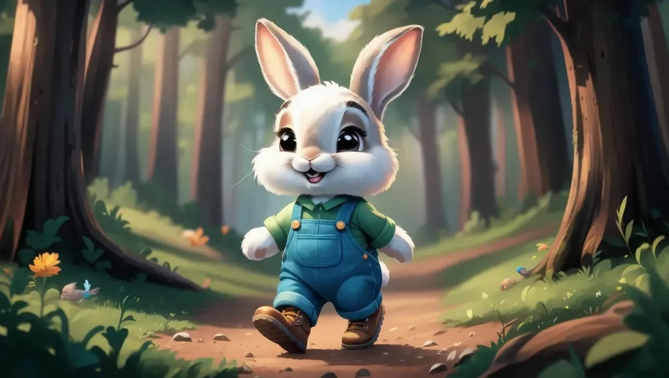 Create whimsical AI-generated cartoon art of a fluffy white bunny in a surreal dreamland forest. Featuring relieved eyes, floppy ears, green shirt, blue overalls, and brown shoes, this hopeful character follows a bird's song through vibrant woods. Perfect for children's books, animations, and happy-themed projects with vivid 16:9 visuals and enchanting storytelling elements.
