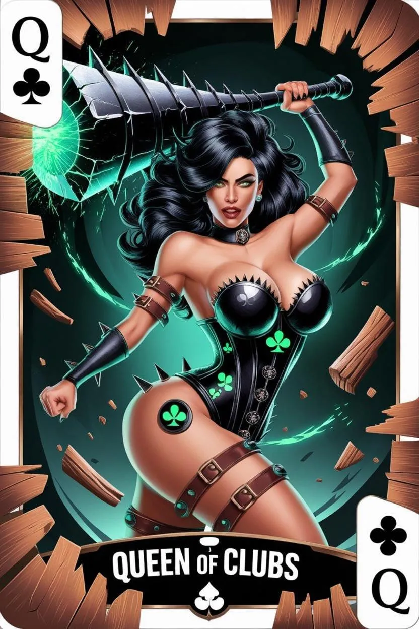 A high-detail Queen of Clubs battle poker card showcases a jet-black-haired warrior with voluminous curls, her curves amplified by a form-fitting corset armored with polished ebony wood panels and glowing club insignias. She wields a gargantuan obsidian-tipped club crackling with viridian energy, its spiked head angled menacingly toward the viewer as she arches her back—full breasts straining against leather straps, round hips cocked defiantly. Mystical emerald lighting contours her voluptuous frame against swirling shadows and floating splintered wood fragments. Card borders erupt with splintered timber textures and floating club symbols, "LET'S GO CLUBBING!" blazing in neon-green graffiti beneath her fishnet-clad thighs. Ultra-crisp 8K CGI render features matte cardstock texture, charred-edge detailing, and spectral afterimages trailing the club's arc.
