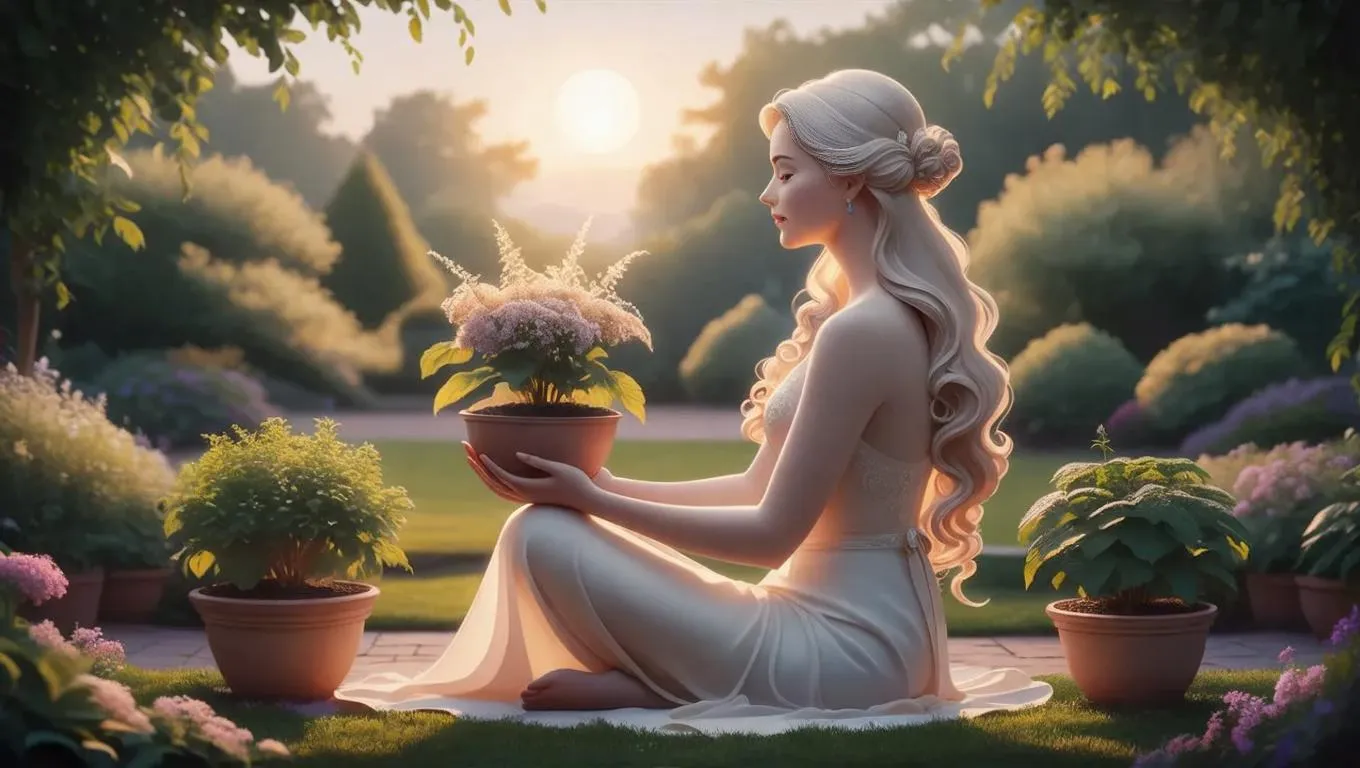 Generate an AI image of a serene nature scene featuring a woman seated from a back view, long hair flowing, as her hands gently touch growing plants on both sides. Explore creative AI art with vivid details and lifelike textures using VivaGo.ai—transform your vision into striking visuals effortlessly.