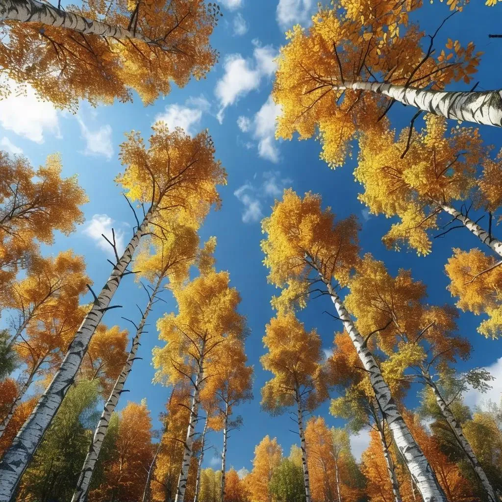 Create stunning AI-generated photorealistic autumn birch forest images with vibrant foliage against blue skies. Perfect for nature wallpapers, seasonal marketing visuals, or artistic projects. Experience 4K resolution details of golden birch leaves and towering tree perspectives through advanced AI image generation technology.