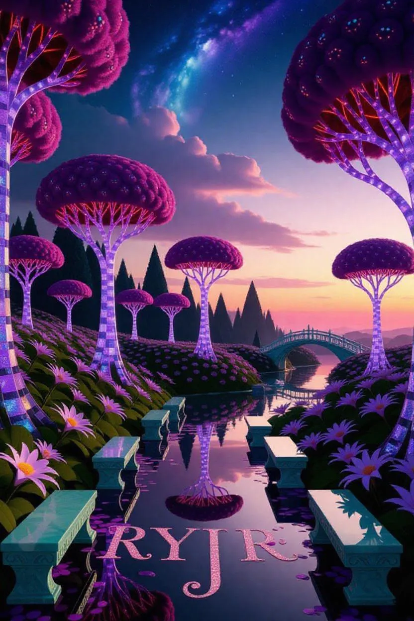 Celestial arboretums drift on pearl cloud-islands, glass-barked trees with amber-glowing sap illuminate quartz foliage. Opalescent pathways refract dawn light into prismatic ribbons on terraces where crystal lilies with cyan halos bloom. The sky shifts from peach-gold to lavender-pink, veined with wispy constellations. Moon bridges link islands crowned with stardust pavilions, fractal spires adorned with comet-dust vines blooming iridescent petals. Below, aurora waterfalls cascade infinitely. Pearl zodiac carvings on jade benches, rose-gold gates in glitter mist, iridescent bubbles over amethyst ponds. Soft glow highlights citrine leaves (stained-glass) and moonstones in diamond soil. Serene with pollen motes in golden light, portrait (2:3) frames garden tiers in cumulus layers. Translucent quartz bark, glowing flora, and liquid-sky reflections merge into celestial harmony.