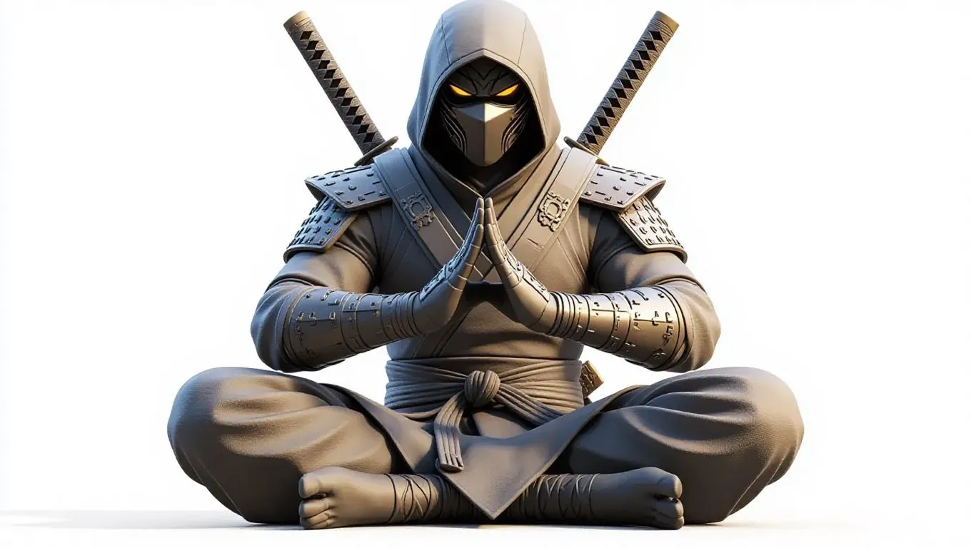 Create AI-generated concept art of a stylized stone ninja statue in Overwatch-inspired design. Features masked warrior in kuji-in mudra, sheathed katana, bold shapes, and clean lines. Ideal for game asset 3D model sheets with symmetrical composition, realistic stone textures, and white background isolation. Perfect for stylized realism in character design or worldbuilding projects.