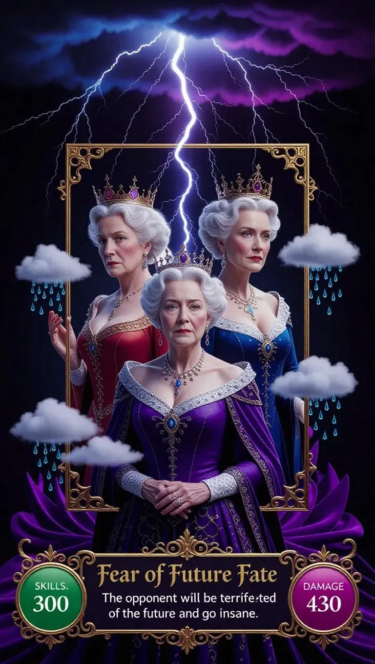 A majestic fantasy electric lightning storm conjures old and young versions of the same queen, adorned on a 3D dimensional game card. The card features a rectangle at the bottom with elegant fantasy text reading "fear of future fate". Below, a description states "the opponent will be terrified of the future and go insane". Bottom left circle: "skills: 300". Bottom right circle: "damage: 430". Ethereal clouds and shimmering tears transform into raindrops, intricate details, glowing aura, royal regalia, mystical realm backdrop, heavens, card labeled "The Fear of Future Fate".