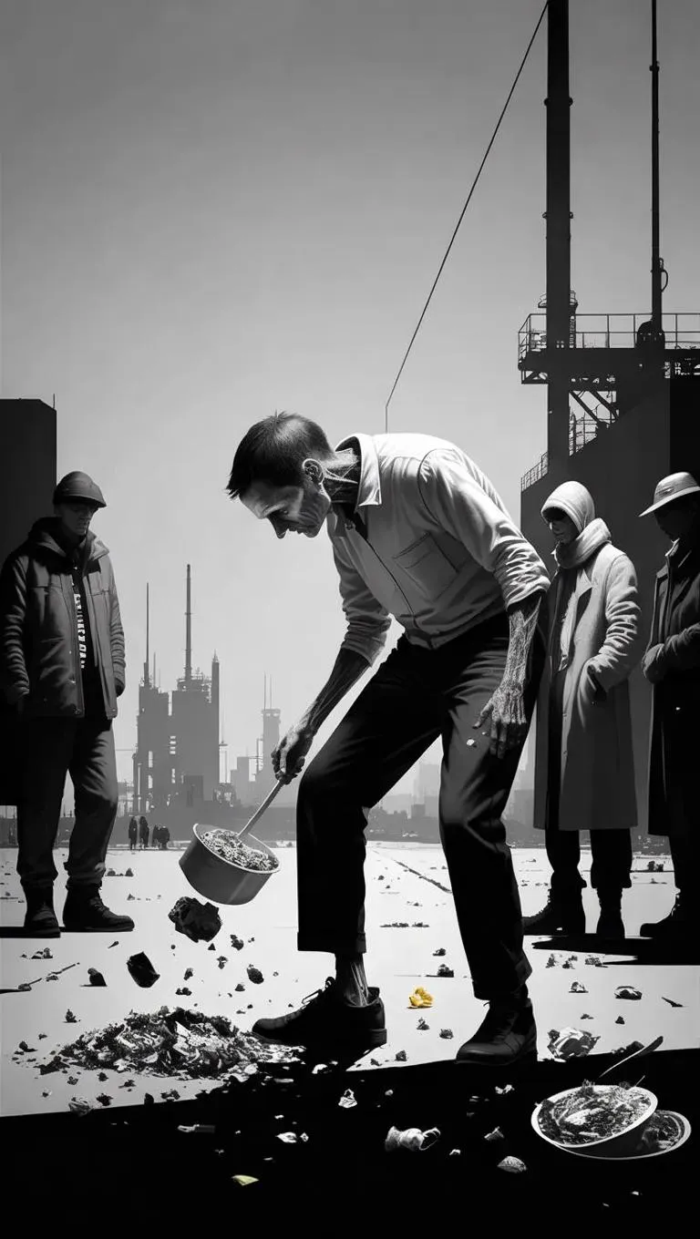 Create a striking minimalist black-and-white AI-generated image depicting dystopian future fashion. Showcase a desperate man scavenging floor scraps with high-contrast textures and avant-garde styling, blending bleak societal themes with edgy visual storytelling. Perfect for conceptual art projects using AI image generation tools for dramatic monochrome effects.