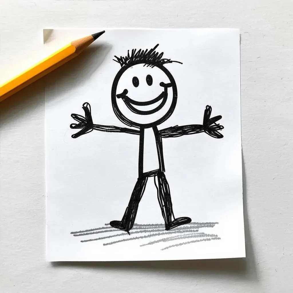Generate a whimsical AI pencil sketch of a smiling stick figure on blank paper. Vivago.ai transforms prompts into playful, minimalist art with comical charm. Create custom cartoon doodles, expressive characters, and humorous hand-drawn visuals using AI image tools. Perfect for quirky illustrations, meme-style drawings, or lighthearted creative projects.
