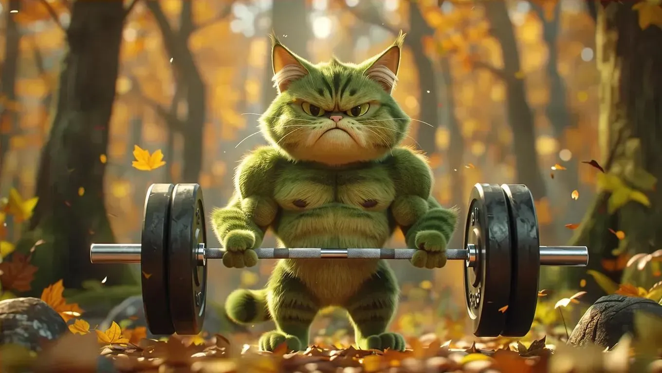 Generate AI anime art of a muscular green cat with oversized ears lifting a barbell in a magical forest scene. Features 3D realism, wide-angle view, natural lighting, vivid autumn aqua tones, shiny light brown hair, and a warm indoor ambiance. Perfect for vivid, imaginative AI-driven character designs.
