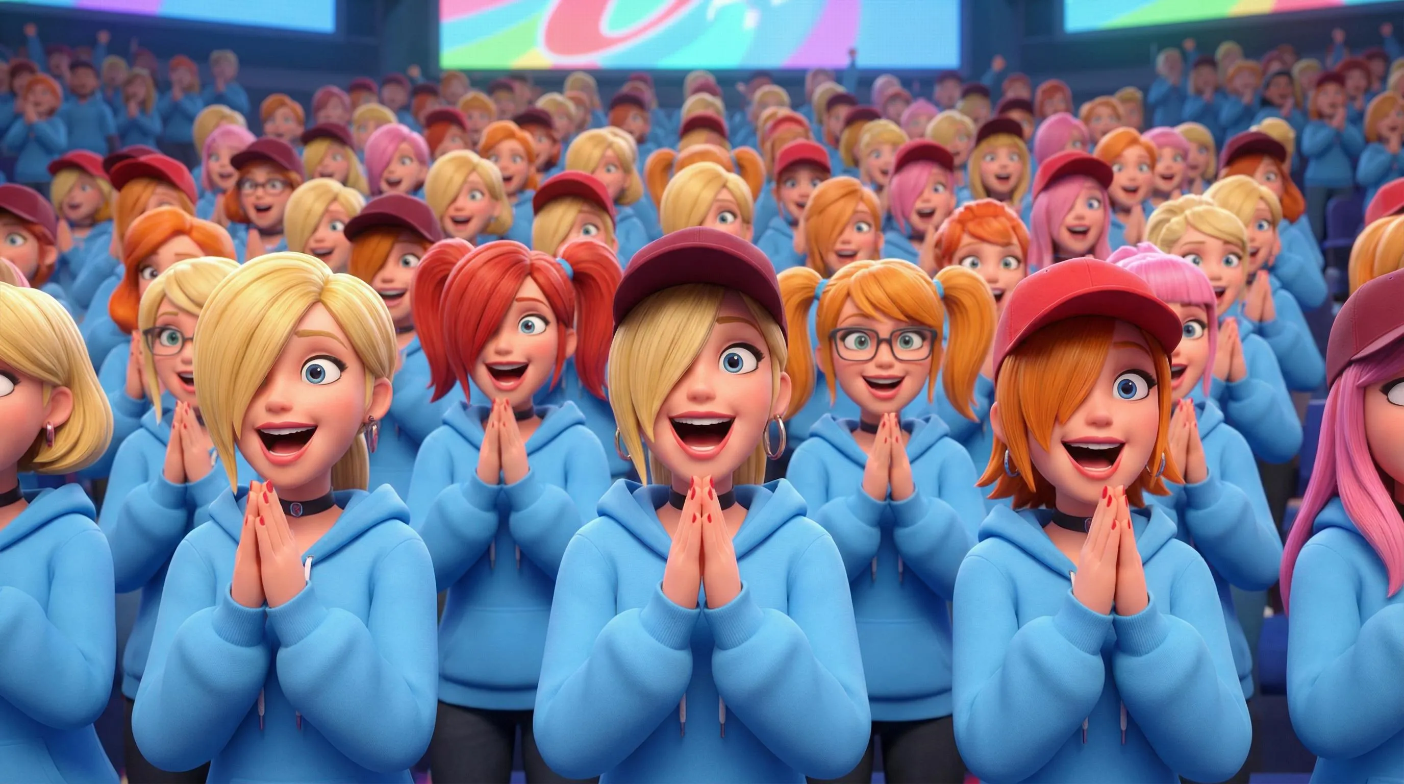 Generate vibrant CGI characters with vivago.ai's AI image generator. Create cheerful adult women with Kaede Akamatsu-inspired side-swept bangs, pigtails, and multicolored hair. Design them in sky blue moe-sleeve hoodies hiding hands, red accessories, and elated expressions. Perfect for anime-style scenes of delighted, screaming audiences praying with adorable hidden hands.