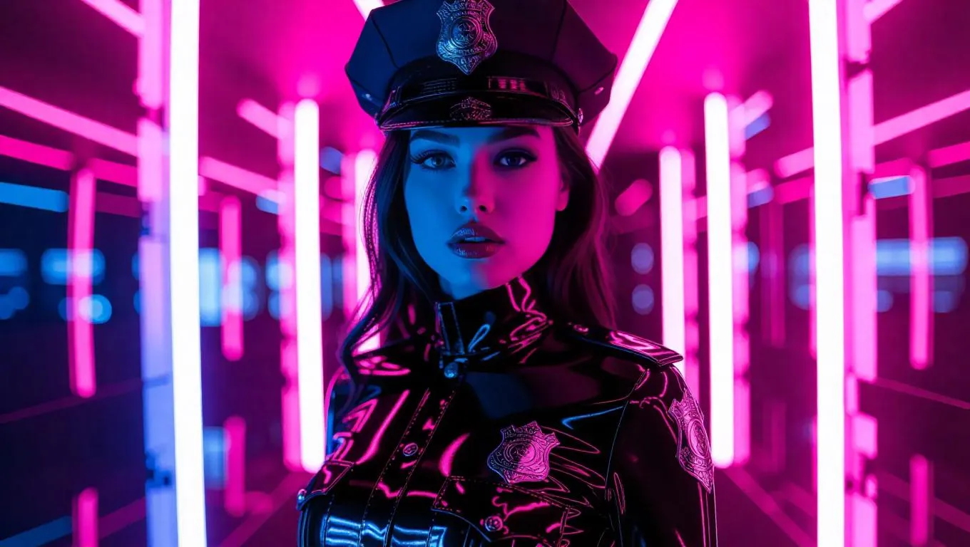 Generate an ultra-realistic woman in glossy black latex police uniform standing confidently in a neon nightclub. Cinematic reflections, sharp high contrast, hyper-detailed 8K masterpiece with perfect skin texture. Create professional AI images with perfect proportions at vivago.ai's AI image generator.
