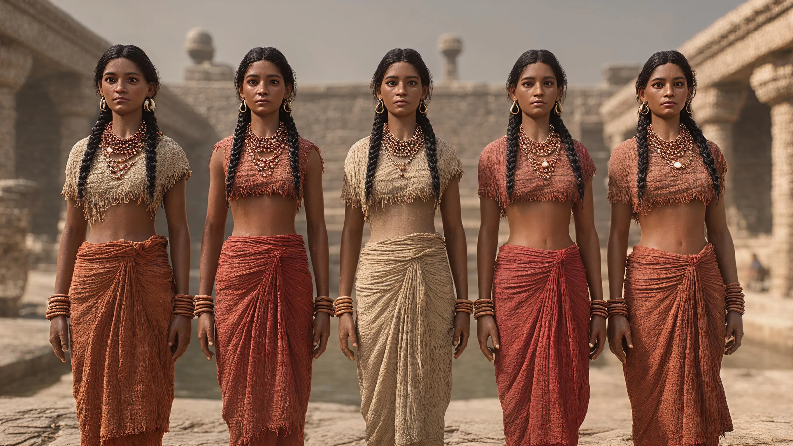 Indus Valley Harappa Culture – Ultra Photorealistic IMAGE for Vivago.ai.2 (FULL Background Restored) Ultra-photorealistic 8K still image of five identical Indus Valley women from Harappa/Mohenjo-Daro (2600–2000 BCE peak period), standing in perfect straight line formation facing viewer at foreground edge of Mohenjo-Daro Great Bath, authentic proto-Dravidian features (smooth medium-brown skin, dark almond-shaped eyes, straight black hair in long braids with shell ornaments, sturdy healthy builds). Stable, archaeologically accurate cotton clothing: Simple draped cotton dhoti-style shorts to knees + upper body wraps in natural earth tones (ochre red, beige-brown, mud-red) Terracotta bangles, carnelian bead necklaces (6-8 etched beads), shell disc earrings, ivory combs Precise positioning: tallest left → shortest right, natural height variation [CRITICAL] FULLY DETAILED PHOTOREALISTIC BACKGROUND – 50+ PEOPLE + OBJECTS: GREAT BATH (12×7m stepped pool directly behind dancers): 10 bathers using copper dippers, water surface reflecting golden hour light IMMEDIATE BACKGROUND (20m depth): 15 MEN (dhoti + wraps): carrying 20kg grain sacks from granary, pushing wooden carts w/ wheel-turned pottery, grinding copper razors on stones, weighing carnelian beads on cubical stone scales (1:2:4 system) 25 WOMEN (knee-length skirts + shoulder wraps): grinding grain on saddle querns, spinning cotton at looms, filling water jars from brick wells w/ pulley ropes, carving conch shell bangles 12 CHILDREN (small draped cloths): playing w/ terracotta bulls/birds, mini wooden carts, clay whistles FOREGROUND OBJECTS (scattered around dancers' feet): 10+ unicorn seals (clay tablets w/ Indus script), cubical stone weights, etched carnelian bead piles, lapis lazuli chunks, small ivory tusks, copper fishhooks/razors MIDGROUND (50m depth): Potters spinning wheels (red pottery), perlenmacher drilling carnelian, farmers w/ wheat/cotton bundles, fishermen mending nets FAR BACKGROUND (lush monsoon valley): Green wheat/cotton fields, flowing Indus river w/ reed boats, golden hour mist ARCHITECTURE: Baked brick walls (1:2:4 ratio) w/ geometric arches, active street drains flowing, courtyard houses w/ flat roofs, NO ruins/palaces Ultra-photorealistic details: Skin pores/sweat sheen/dust on ALL 55+ figures' feet Cotton weave texture, brick mortar gaps, copper patina Perfect depth of field: razor-sharp foreground dancers + objects, detailed populated background Warm golden monsoon lighting, physically correct shadows