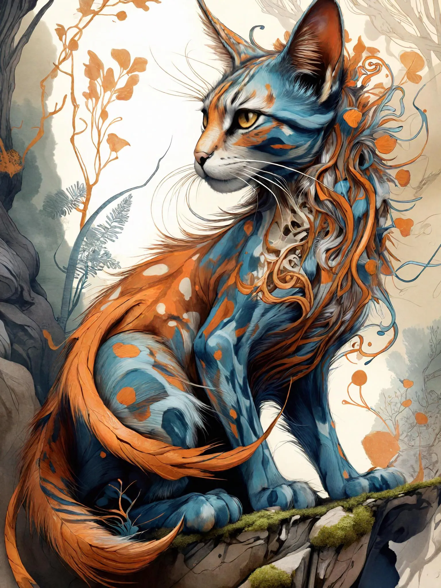 Generate a mystical AI ink sketch of a surreal forest cat with triadic colors, hyper-detailed textures, and fluid swirling lines. Inspired by Rutkowski and James Jean, this 8K pop-art illustration combines volumetric lighting, decorative surrealism, and dreamlike serenity. Perfect for concept art lovers seeking non-realistic, charismatic visuals with matte finishes and crystal-clear focus via vivago.ai's AI effects.