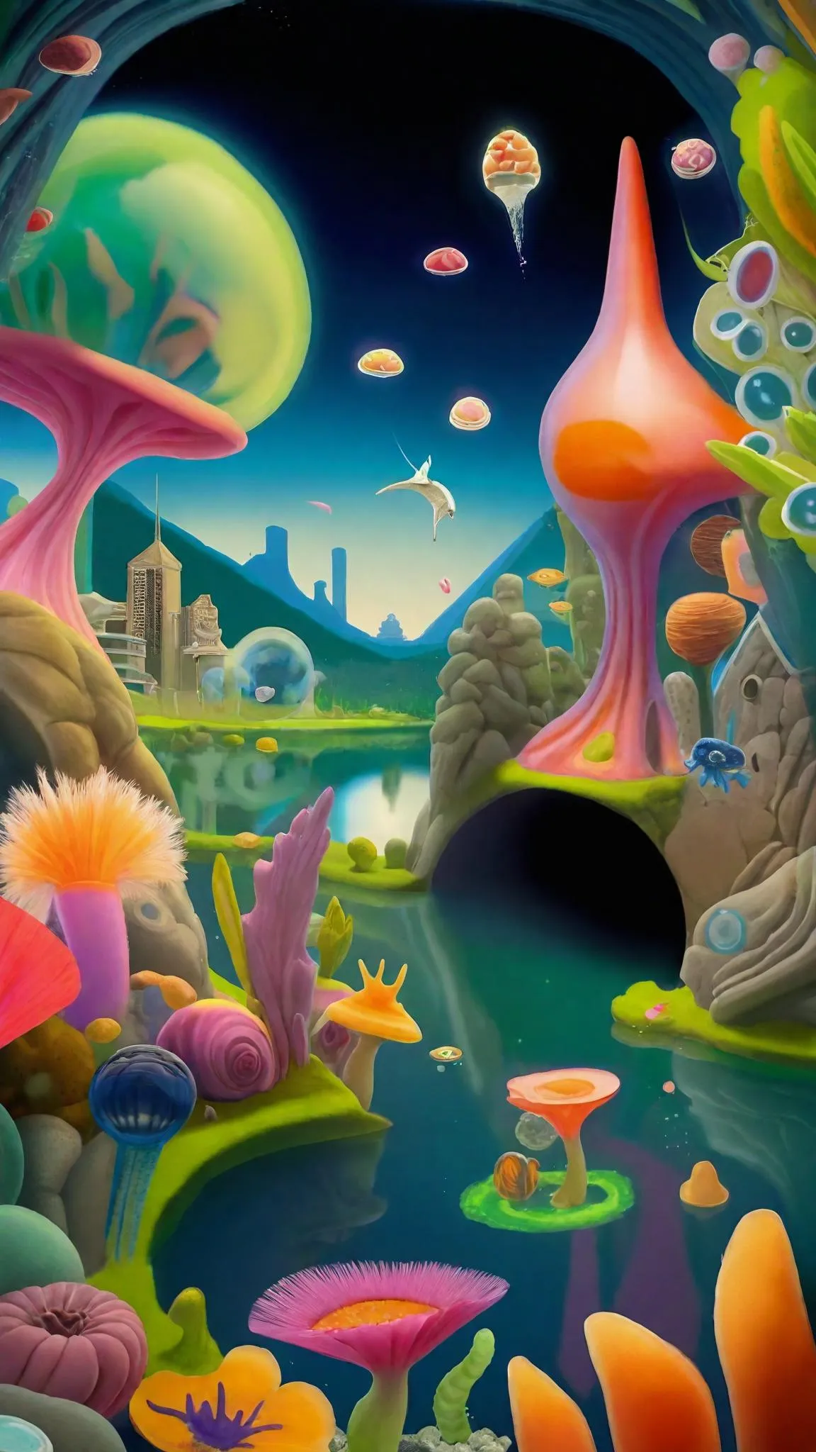 beautiful fantasy city lake bottom city scape, completely submerged camera angle. the clear green blue lake under the water surface. Eric carle Little pink 4 legged jelly earthly delight creatures floating  and swimming and sliding around the under water city in the Cretaceous under water scene. scape of submerged natural rocks and coral . hyper realism#An Underworld,Underwater World,Waterpark,Meadow