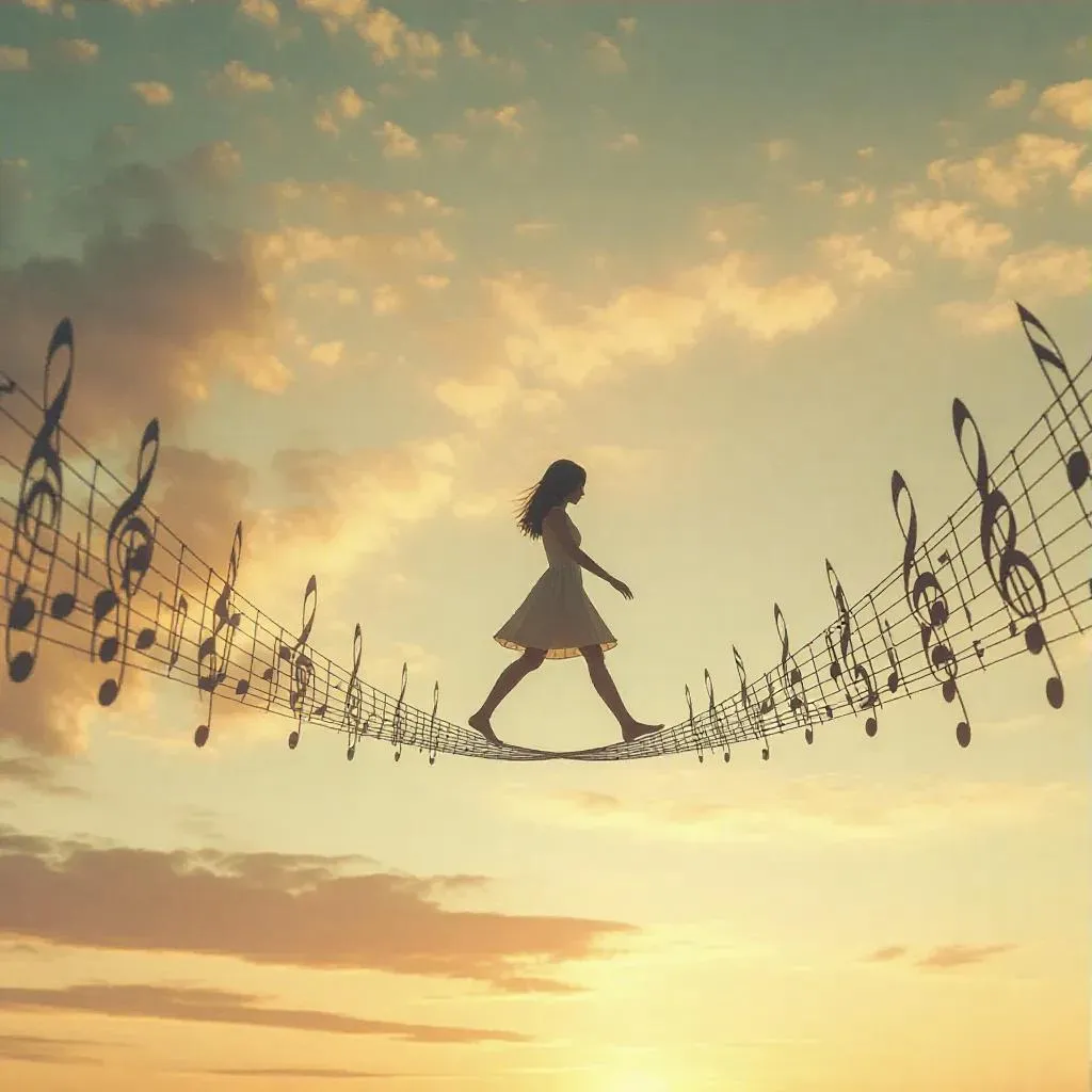 Create stunning AI-generated images of a girl barefoot on a musical staff wire bridge. Experience hyperrealistic sunset glow, minimalist surrealism, and captivating visual impact. Perfect for artistic renders of balance, freedom, and daring feats blending harmony with hyperrealistic detail. Discover your AI art masterpiece with vivago.ai. (45 words)