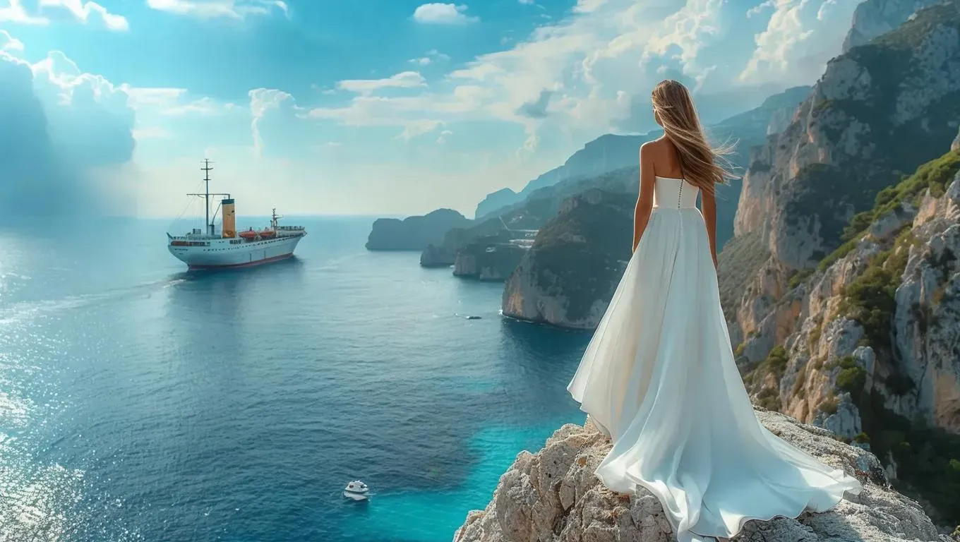 Create ultra-realistic AI visuals with vivago.ai. Transform text prompts into breathtaking images of a girl in a white dress gazing at a distant ship from a mountain edge. Use advanced AI effects and editing tools to achieve lifelike scenery, dramatic landscapes, and professional-grade creative results.