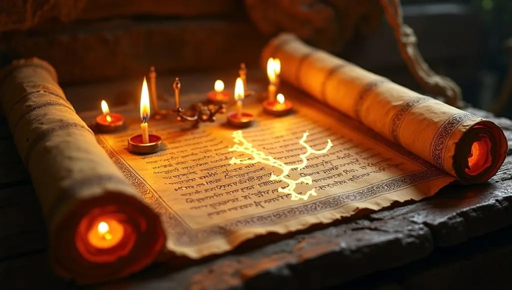Discover AI-generated ancient scrolls with intricate hand-drawn calligraphy, bathed in soft candlelight and ethereal golden glow. Symbolizing timeless wisdom, these mystic visuals transform text into art. Create captivating, AI-powered historical narratives effortlessly with advanced tools.