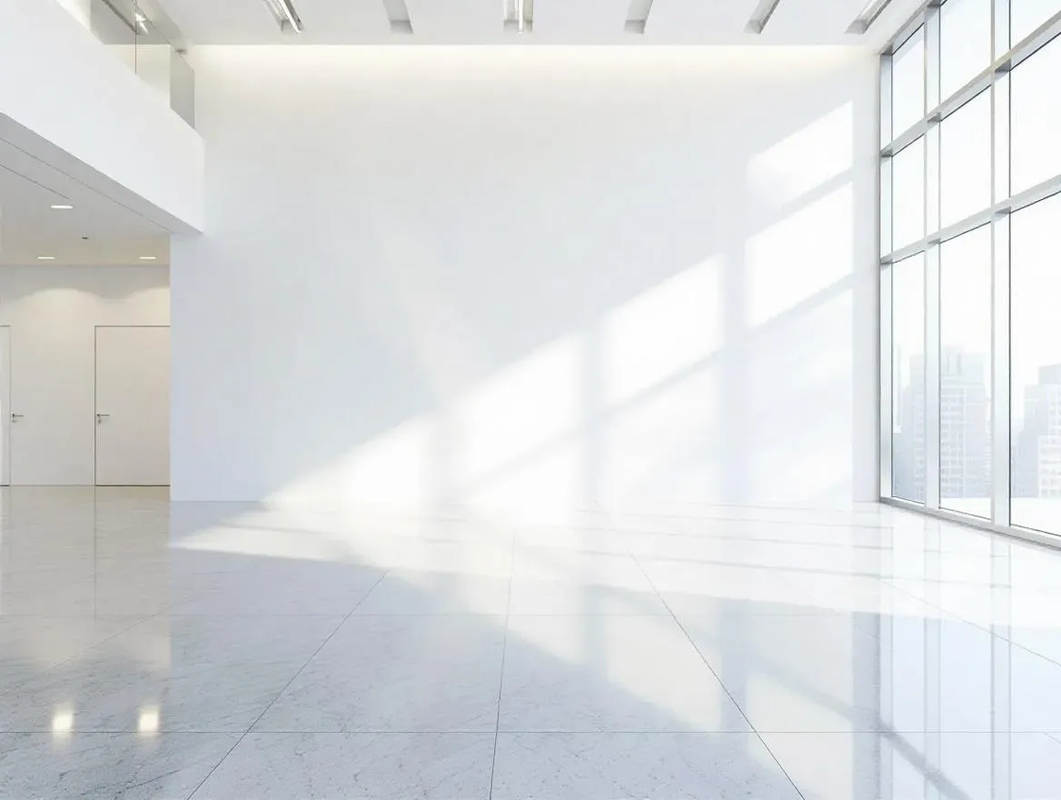 View of blank white corporate atrium wall from 15 feet away. Slight perspective on wall, not an orthographic front view. High ceilings. Very modern architecture. Strip of granite floor visible at bottom. Soft, diffuse 5500K light coming from a floor-to-ceiling north-facing glass wall just visible on right side of image. No hard shadows. Light gradation across the wall, brightest near the window and fading off across the wall.