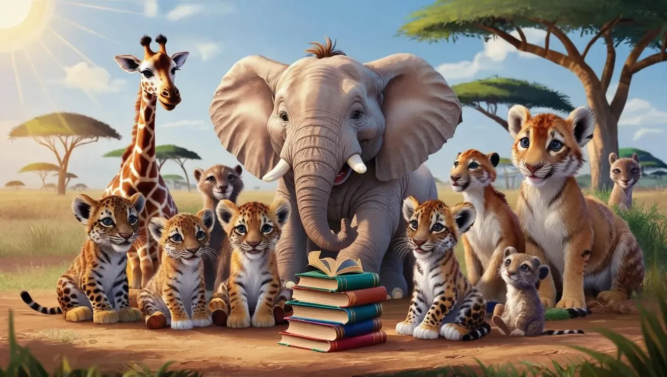 Vibrant 3D cartoon scene of diverse animal cubs attending a wise elephant's savannah storytime. Featuring colorful books, acacia trees, and sunny African clearing, blending playful animation with literary adventure in a lively, educational woodland setting.