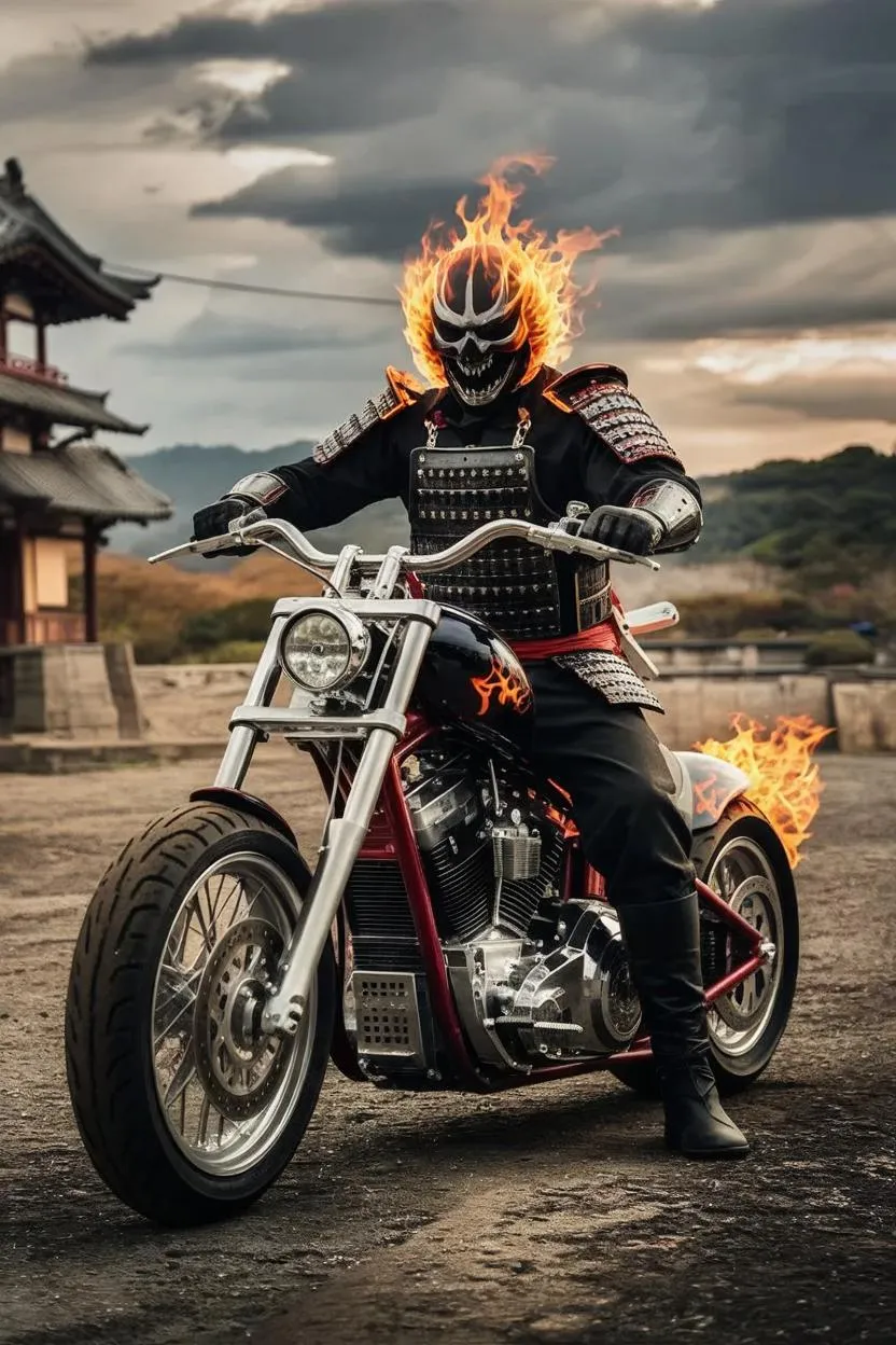 Generate a striking AI image of a samurai-inspired Ghost Rider riding a chopper bike with vivago.ai. Transform text prompts into dynamic visuals using advanced AI effects for edgy, professional-grade artwork. Ideal for creating unique, fiery motorcycle-themed designs with a supernatural twist.