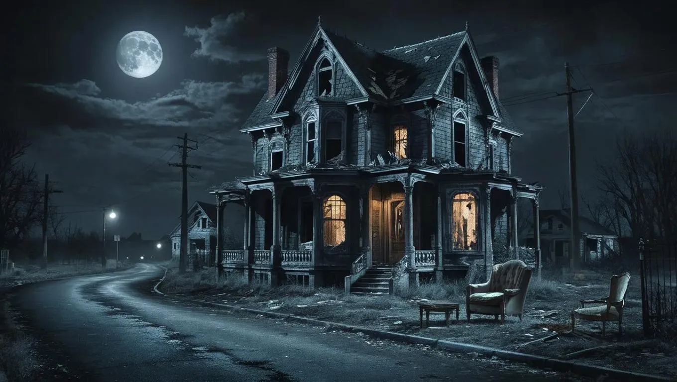 Generate a haunting 16x9 AI image of an abandoned house on a dark street. Eerie atmosphere, crumbling facade, and mysterious vibes for spine-chilling visuals. Create professional-grade horror scenes with Vivago.ai's AI effects and text-to-image tools. Perfect for eerie storytelling and suspenseful content creation.