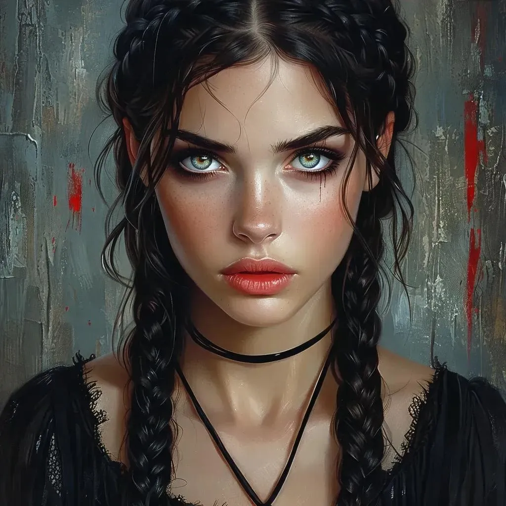 Create a vivid AI-generated image of a makeup-free young woman with braided dark hair, striking grey-red eyes, and tattered dark clothing. Capture her despair amid ominous shadows, hidden black necklace, and raw vulnerability. Explore emotional storytelling with Vivago.ai's AI tools for haunting character design and dramatic visual narratives.