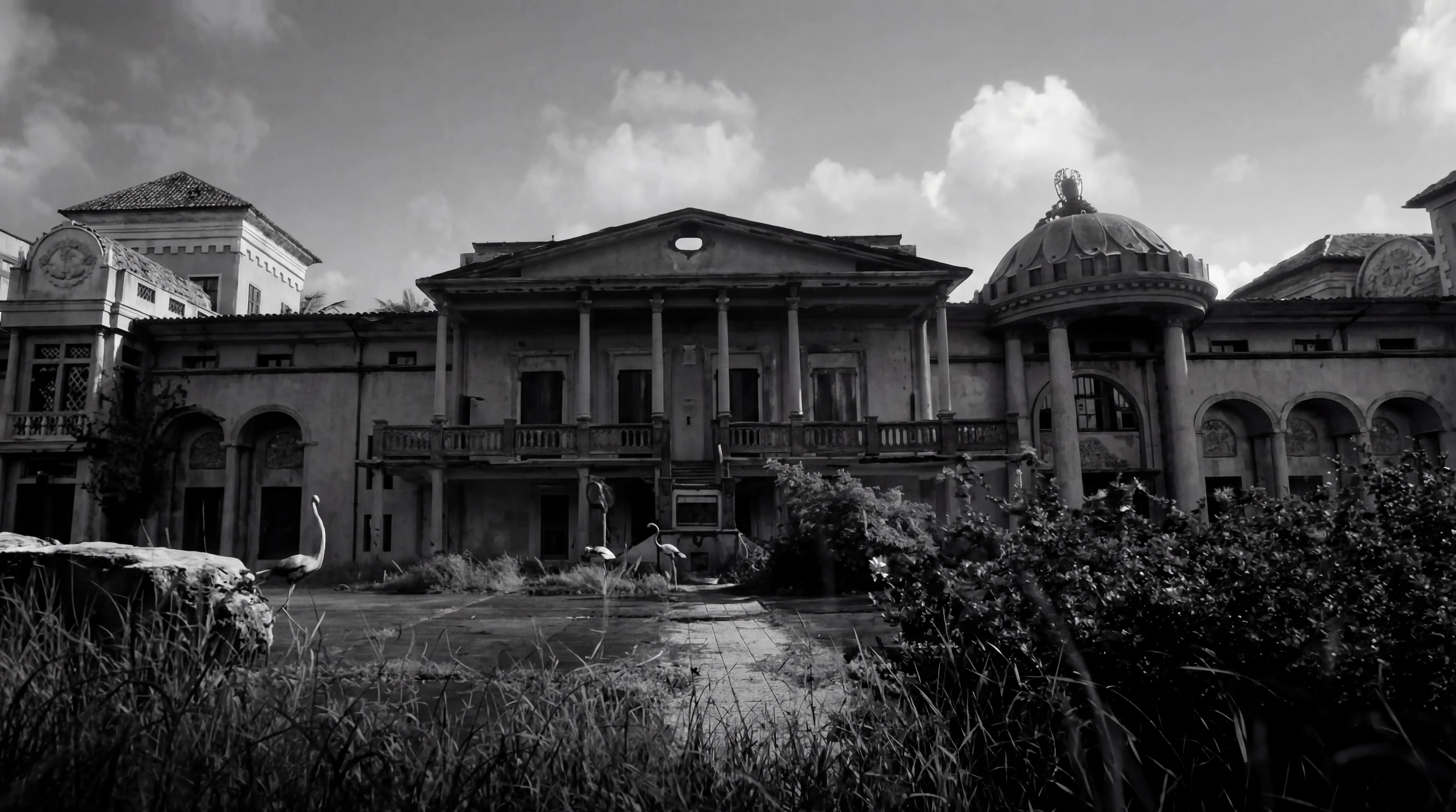 Generate the iconic Kord Estate from Blue Beetle (DCEU) with AI. Black-and-white scene set near West Palisades Trail, Metro Atlanta, circa 1940s-1950s. Create cinematic, non-photographic visuals instantly. Explore vivago.ai's AI image generator for powerful creative tools.