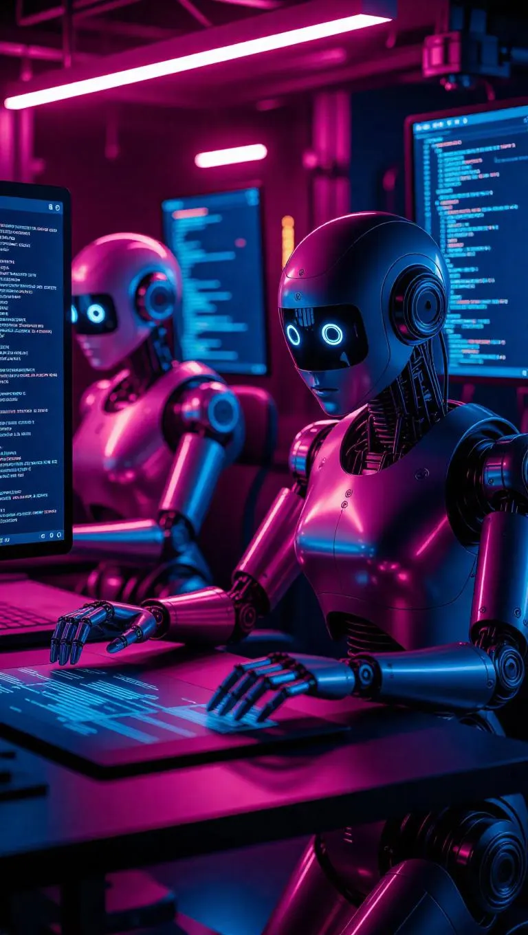 A dynamic time-lapse video showcasing robots designing, coding, and writing, set against a futuristic backdrop. Robots with sleek, metallic bodies work in harmony, their movements fluid and precise. Glowing screens display code and designs, with holographic projections adding a layer of sci-fi flair. The scene is bathed in neon lights, emphasizing the advanced technology and innovation.