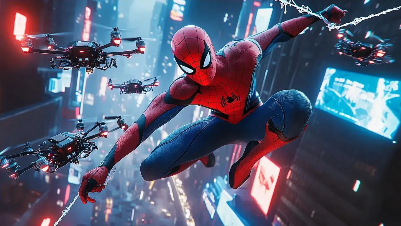 AI-generated Spider-Man action scene: high-tech drones, rapid mid-air combat, dynamic visuals. Vivago.ai crafts Marvel-inspired superhero imagery with cutting-edge AI effects for thrilling, action-packed video and image generation. Elevate your content with AI-powered superhero battles.