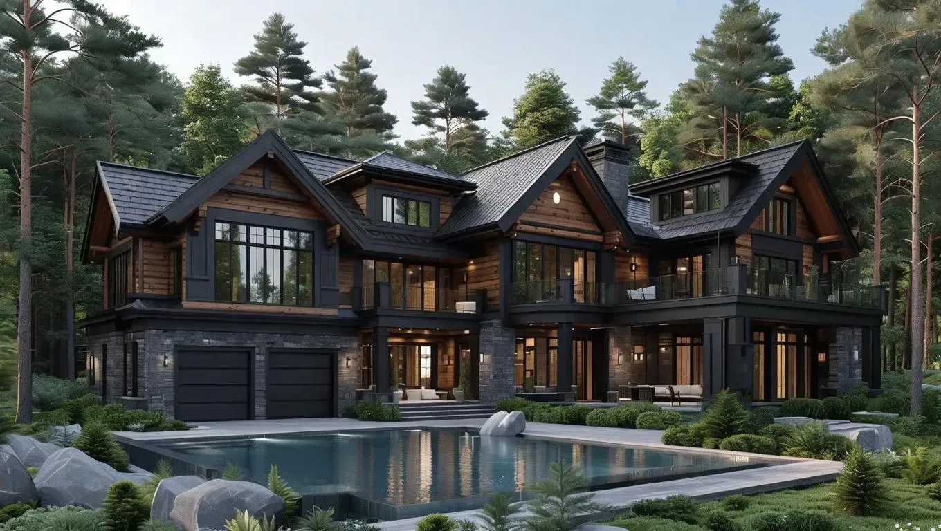 Generate a realistic AI image of a luxurious wooden house with sleek black accents, featuring a garage and swimming pool nestled in a serene forest. Perfect for visualizing modern architectural designs in natural settings with detailed, lifelike precision.