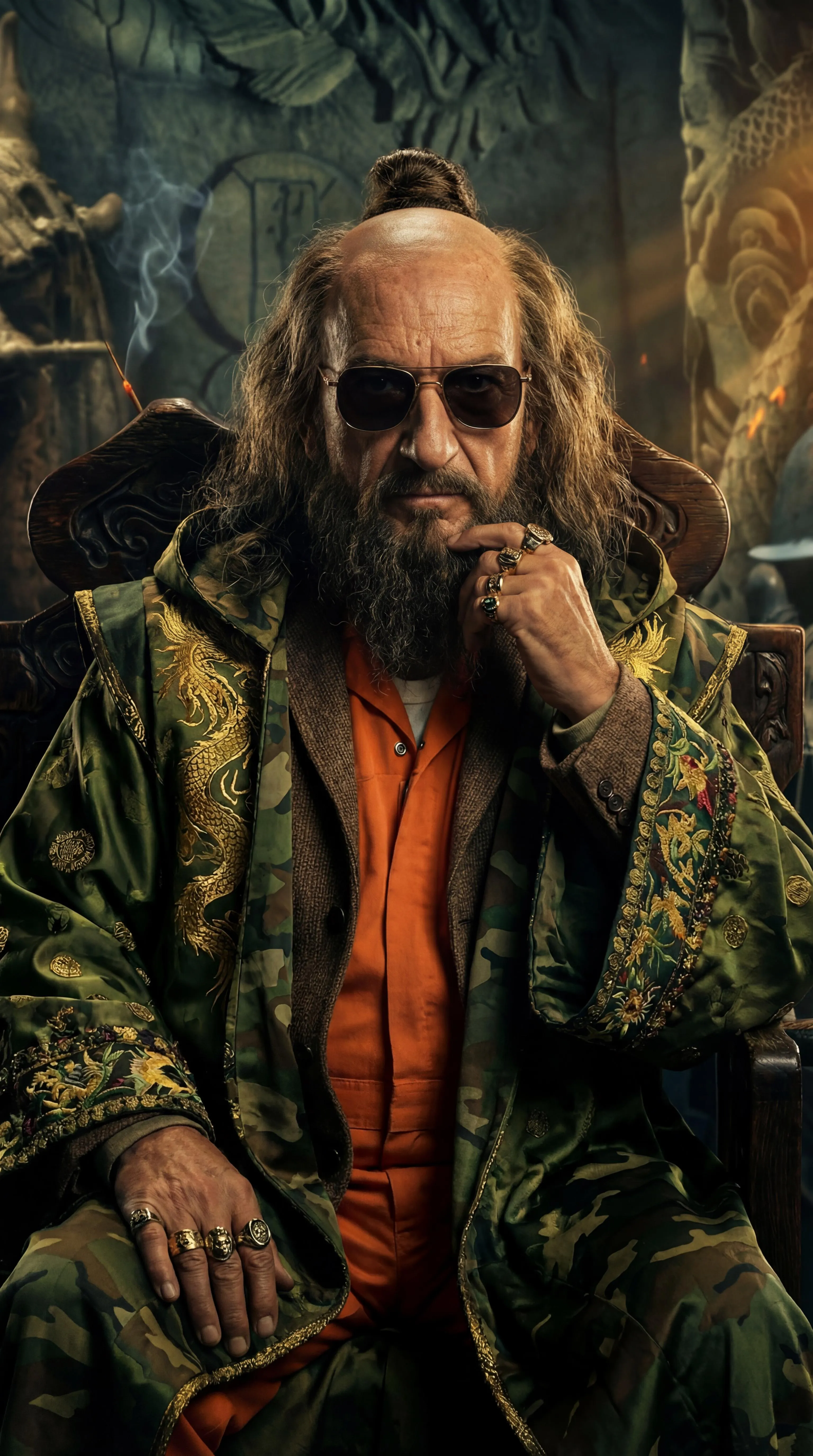 Generate a seamless composite of Trevor Slattery (Ben Kingsley) merging all four iconic looks. AI combines his Iron Man 3 warlord outfit, All Hail the King jumpsuit, Wonder Man sport coat, and Shang-Chi dragon robe. Includes all hairstyles, goatees, sunglasses, and ten rings. Create this complex Marvel character fusion with Vivago.ai's AI image generation.