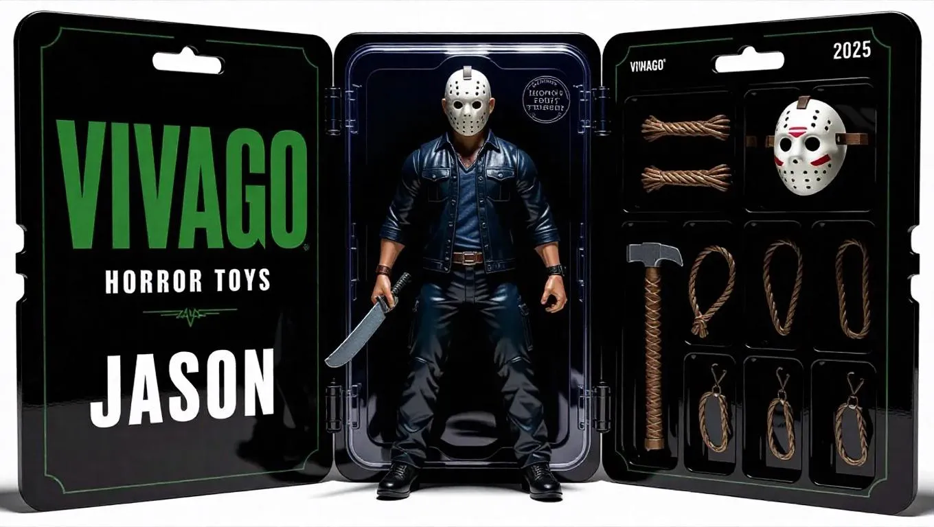 Premium Jason horror movie action figure in a blister pack, featuring photorealistic details, a standing pose, and serious expression. Includes character-specific accessories in side compartments. Black background with "VIVAGO Horror Toys" header, 2025 label, and vibrant green/white text. High-definition collectible toy for horror enthusiasts, blending cinematic authenticity with premium packaging design.