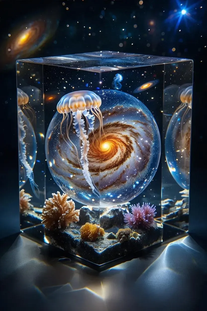 Create a stunning sci-fi cosmic diorama with AI: hyper-realistic quasar and glowing jellyfish encased in a resin cube. Features volumetric lighting, HDR sharpness, and photorealistic detail. Perfect for high-resolution visuals, space art, and futuristic design projects. Elevate your creative concepts with cutting-edge AI image generation and professional editing tools.