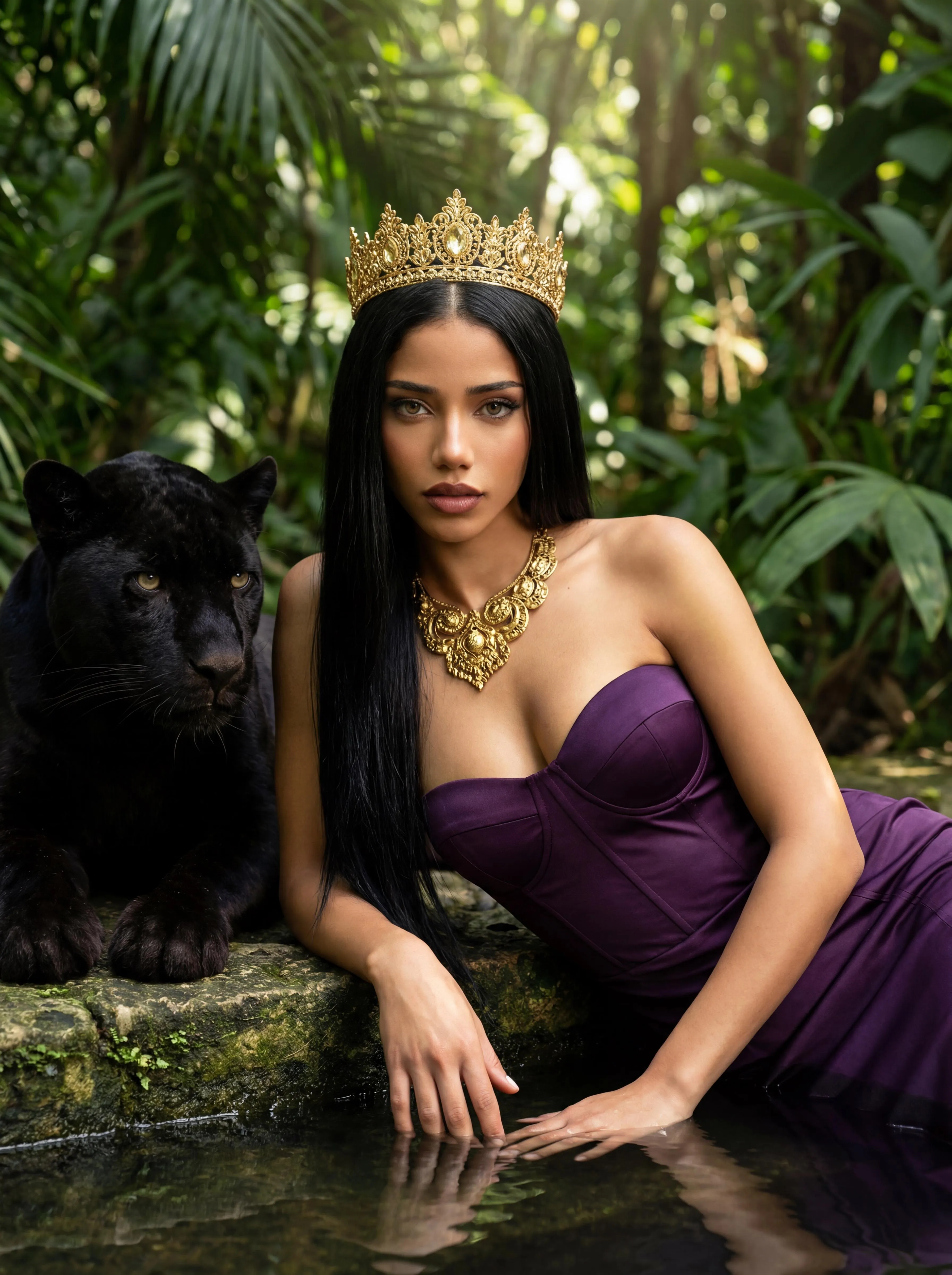 Create hyper-realistic jungle queen AI portraits with vivago.ai. Generate a powerful, regal woman with sleek black hair in a striking purple dress, adorned with gold crown & necklace, alongside a majestic black panther. Lush tropical jungle setting with cinematic lighting & vibrant colors. Transform your vision into professional fantasy art.