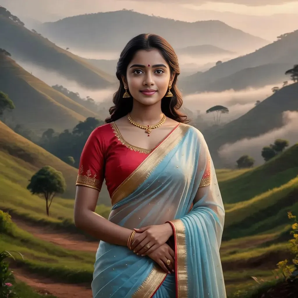 AI-generated portrait of Divya, a 26-year-old woman in a light blue saree, standing against Sakleshpur's misty hills. Realistic style captures her hopeful expression, cinematic lighting, and serene small-town backdrop as she prepares for city life. Detailed, warm visuals blend traditional attire with modern ambition for professional-grade AI imagery.