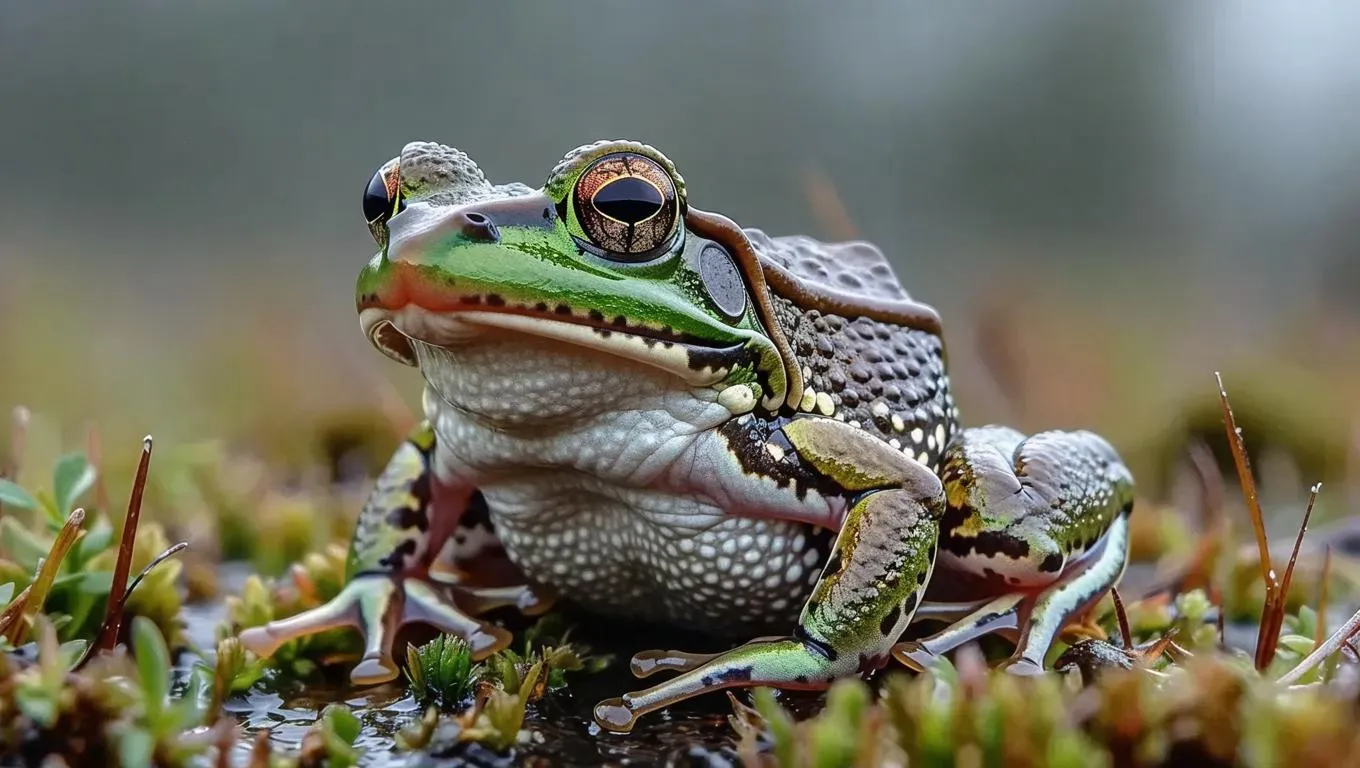 Generate a resilient frog AI image with VivaGo AI, featuring green, gray, and bluish hues. Depicting cold moor adaptations, this small amphibian symbolizes survival in humid climates. Create professional AI visuals showcasing nature's resilience through advanced effects.