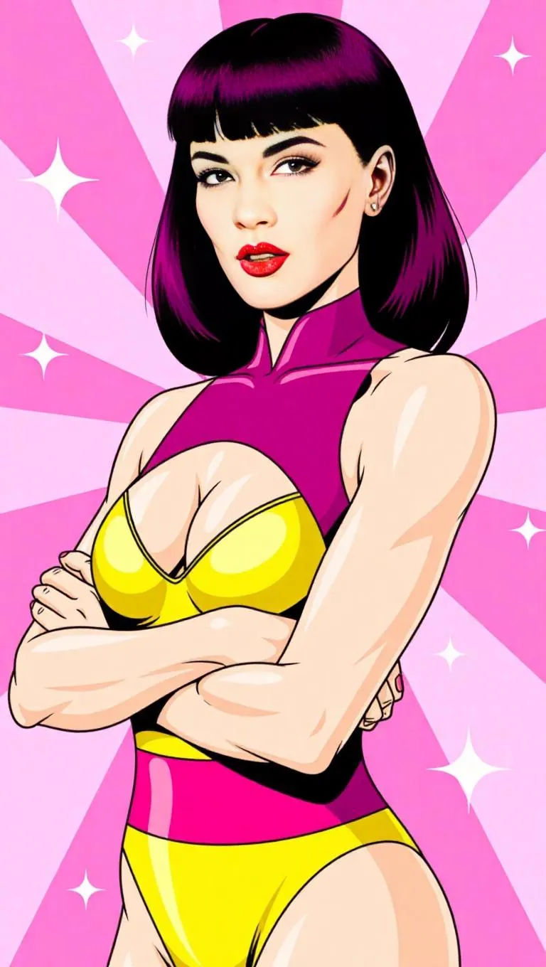 Generate dynamic AI superhero art with vivago.ai! Create vibrant female superhero illustrations in bold yellow-purple swimsuits against pink starry backgrounds. Customize bob hairstyles, red lipstick, and determined expressions using advanced AI image generation tools for professional-grade comic or character design visuals.