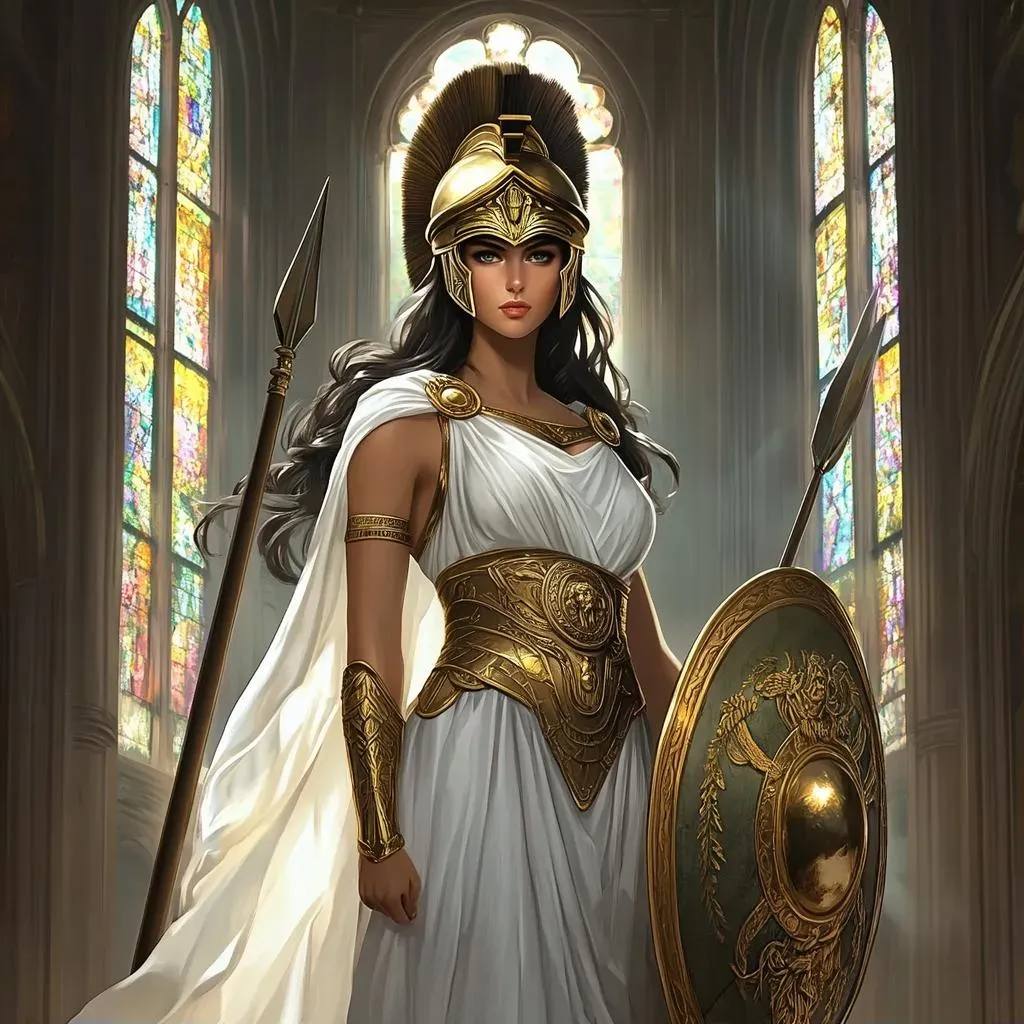 Generate a striking anime-style Athena, Greek goddess, blending fantasy and realism with intricate armor in a majestic cathedral setting. Vivago.ai crafts divine AI art for mythical storytelling, merging vibrant anime aesthetics, ethereal lighting, and lifelike details for professional-grade creative visions.