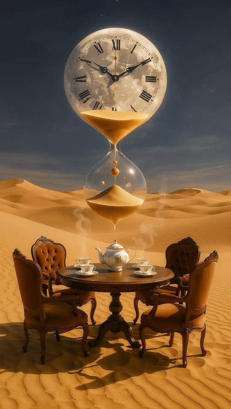 A surreal desert tea ceremony unfolds atop golden dunes shaped like swirling clock faces. A translucent hourglass moon hangs in the sky, dripping luminous sand into porcelain teacups mid-pour. The table floats slightly above the ground, surrounded by velvet chairs casting no shadows. Steam from the teapot curls into time glyphs, while pastries shaped like celestial bodies orbit slowly above crystal saucers. The wind carries echoes of ticking clocks. Everything shimmers with an ethereal glow, blending baroque elegance with temporal distortion — a vision of timeless beauty suspended between dream and decay.