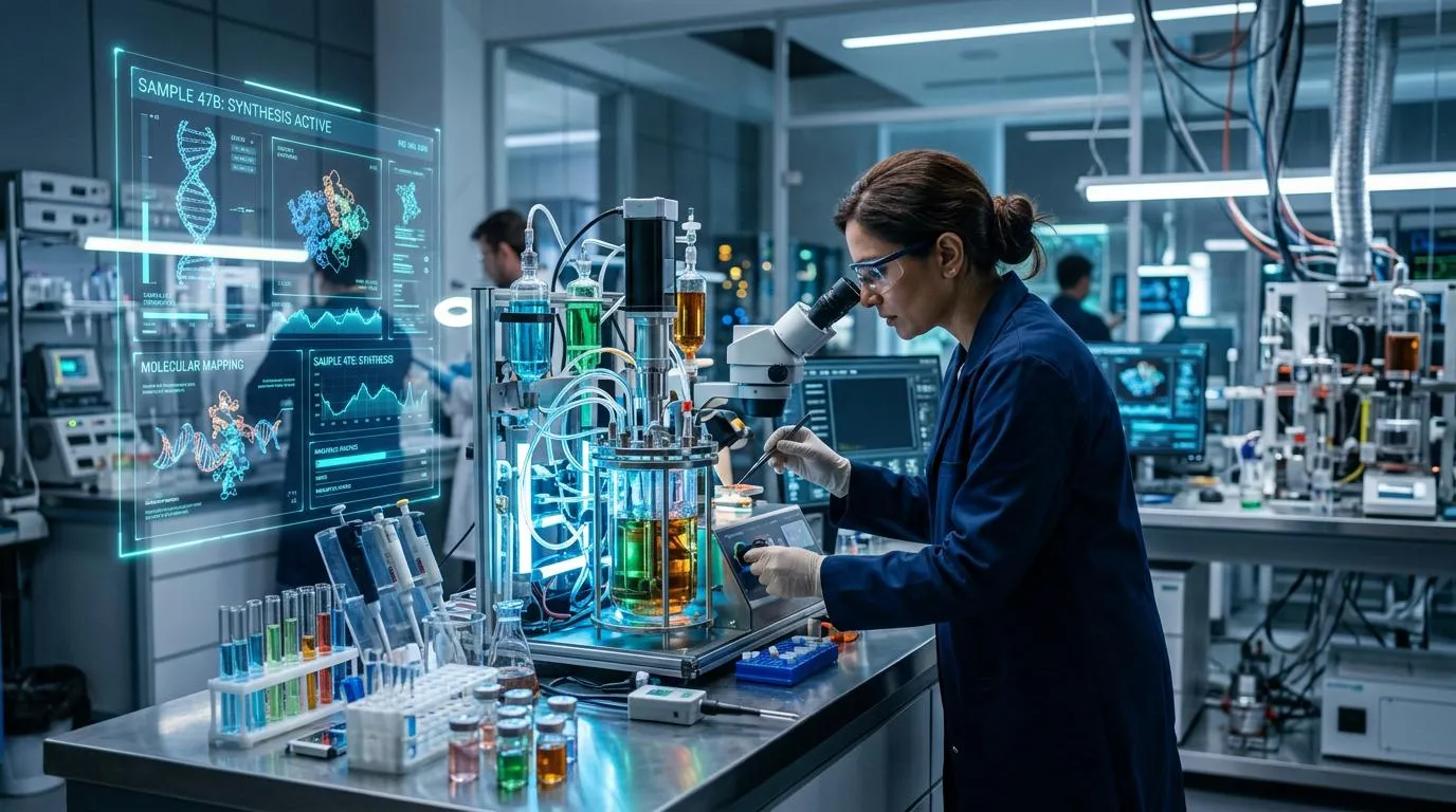 A futuristic laboratory with advanced machinery and glowing lights, where a scientist meticulously operates complex equipment, surrounded by test tubes and holographic displays, creating an atmosphere of innovation and discovery.
