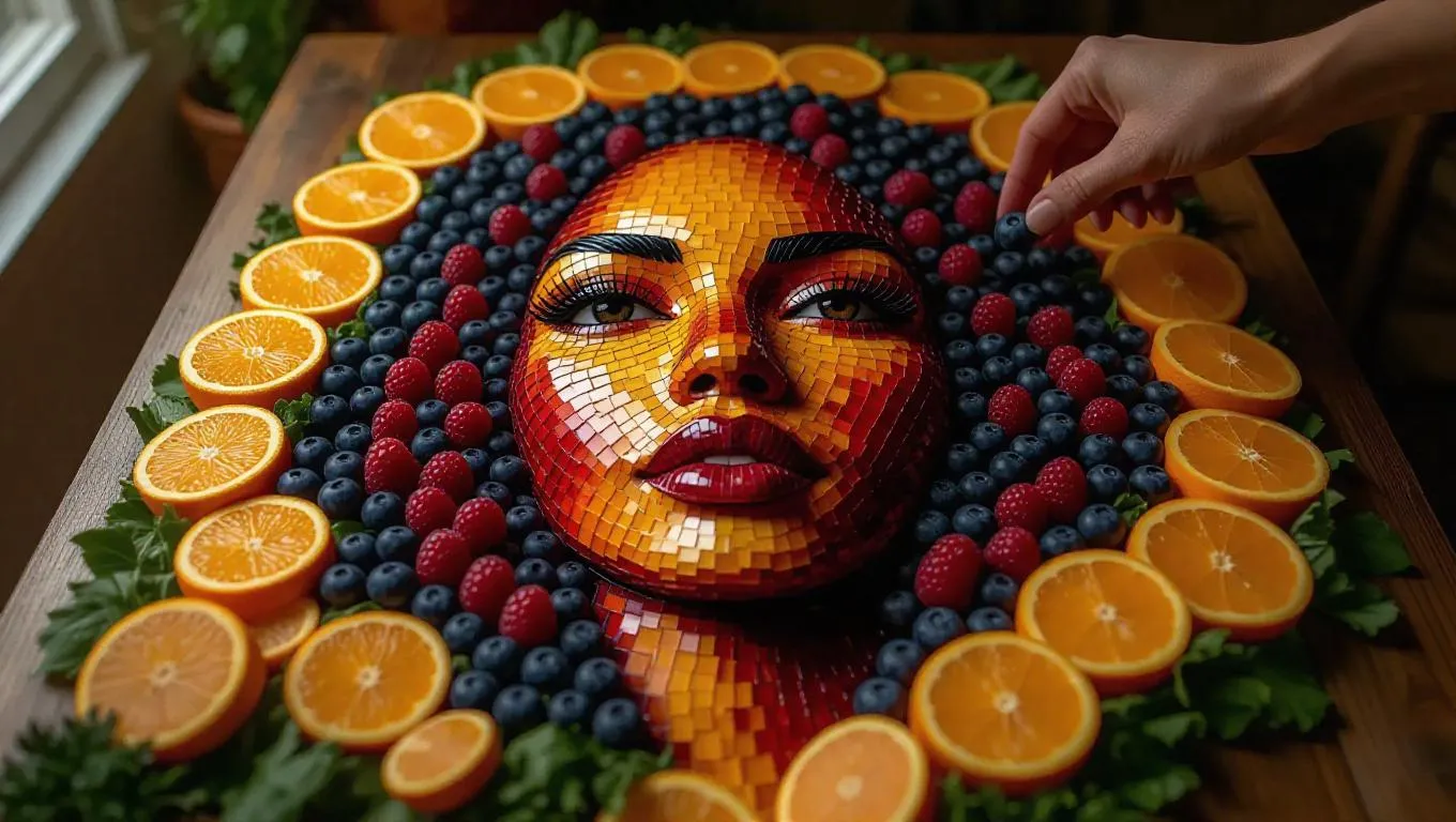 Craft cinematic AI art with Vivago.ai: Generate a vibrant fruit-and-vegetable mosaic portrait on a rustic table, blending sliced berries, citrus peels, and leafy greens into precise details. Capture warm natural lighting, moody tones, and an art-film aesthetic. Perfect for evocative visuals with shallow depth of field and dynamic compositions. Transform prompts into stunning AI-generated imagery effortlessly.