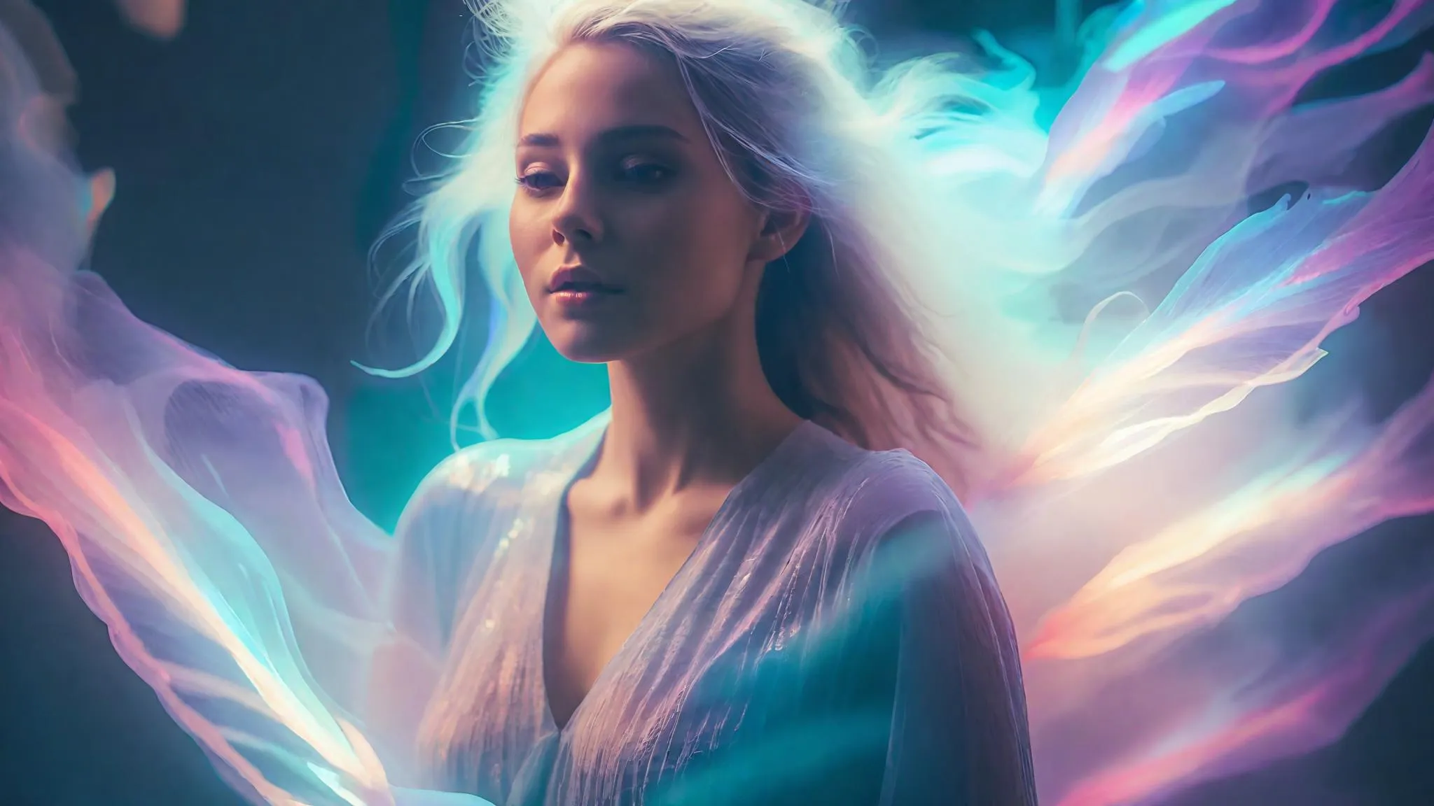 Capture ethereal beauty with this AI-generated spectral woman featuring a glowing aura, spiritual energy tendrils, and a dreamy surreal atmosphere. Iridescent pastel hues, neon accents, and vibrant glowing mist create soft, feathery textures in 8K resolution. Masterpiece-quality visuals for mesmerizing digital art.