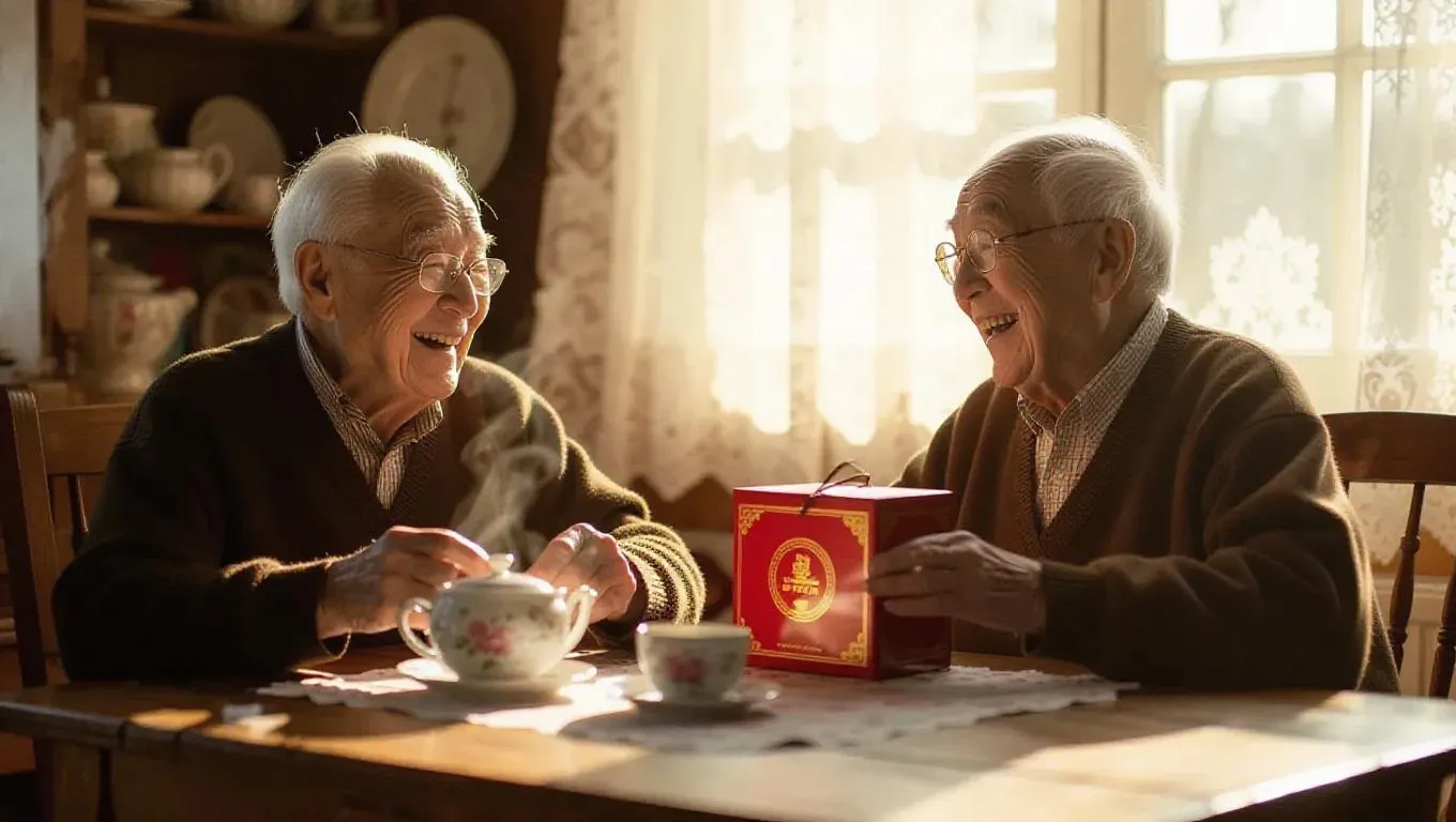 Craft heartwarming elderly tea moments with AI image generation. Showcase Doi Dep tea's vibrant packaging, steaming porcelain cups, and sunlit rustic interiors. Highlight intergenerational connection through crinkled laughter lines, weathered hands, and floral shortbread plates. AI effects enhance cozy atmospheres with soft light beams, curling steam, and wide-angle compositions capturing lace curtains and garden views. Perfect for nostalgic beverage branding visuals.