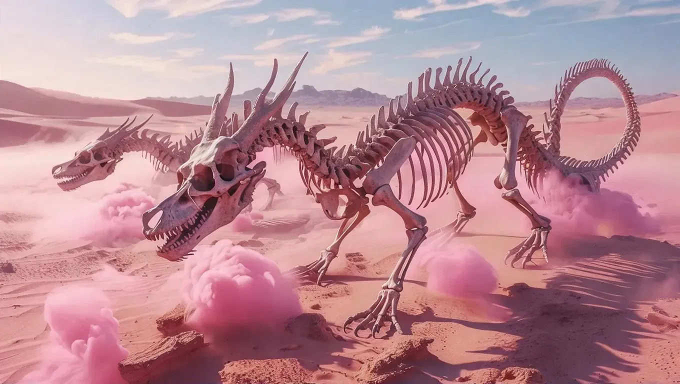 Explore a vibrant pink desert with surreal, mist-dragon skeletons hovering above sands. This Wes Anderson-inspired AI scene merges millennial aesthetics and 2000s movie flair, blending dreamlike symmetry, soft pastel skies, and eerie beauty. Perfect for cinematic AI art, combining whimsical ethereal visuals with retro-futuristic mystique.
