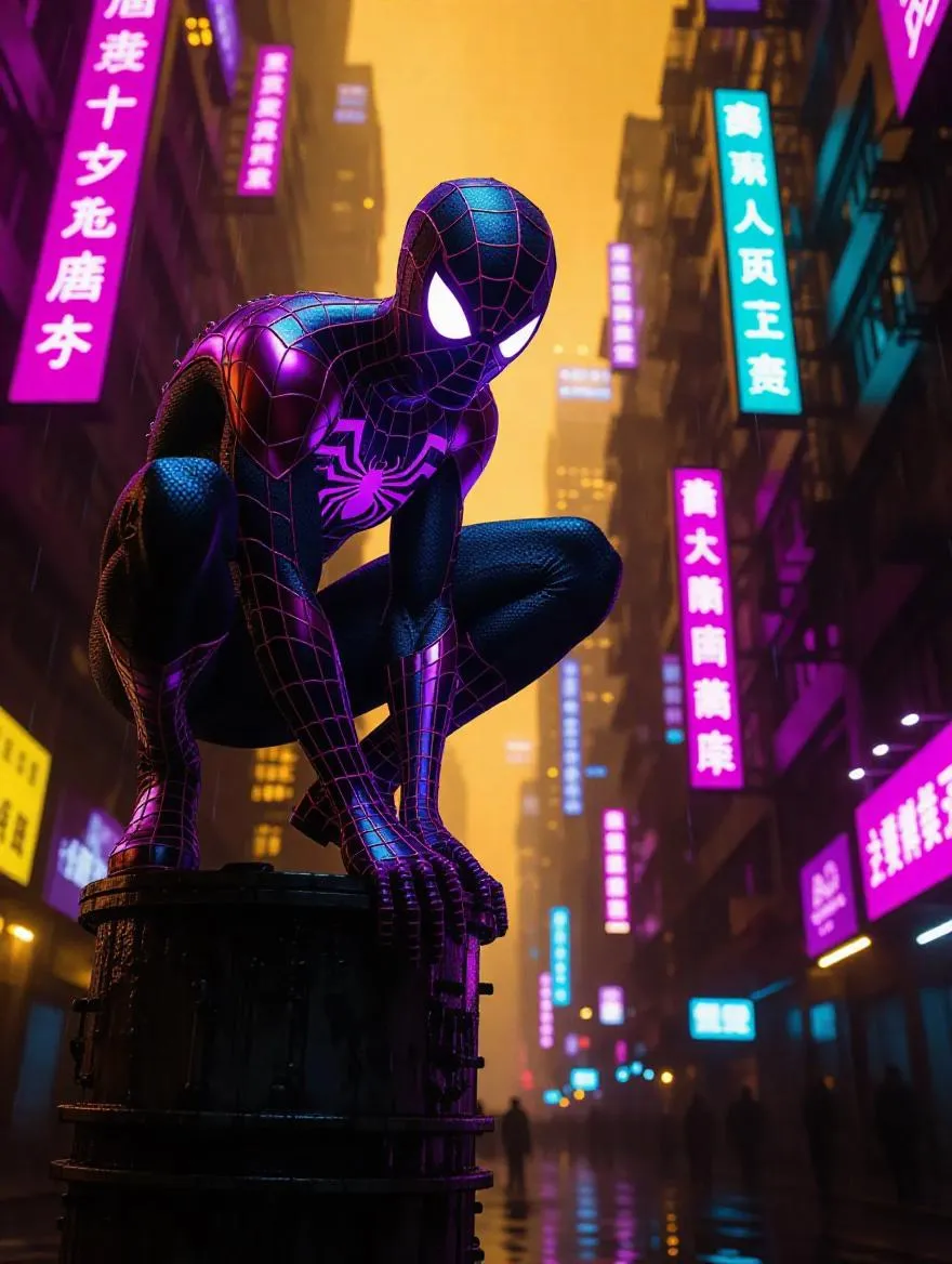 A cyberpunk Spider-Man crouches on a corroded data tower, his overhauled suit rippling with bioluminescent purple nanofibers shifting between plum and violet hues under flickering neon signs. Metallic spine exoskeleton protrudes, glowing with pulsating cobalt energy cores feeding into shoulder-mounted kinetic accelerators crackling with arcing electricity. Retractable forearm blades extend from reinforced carbon-weave sleeves, ready to strike. Masked lenses display scrolling holographic threat assessments. Rain-drenched megacity canyon, pyramid-shaped corporate hubs piercing acid-yellow clouds, neon-kanji projections reflecting in oily puddles teeming with cyborg eels. Hyper-detailed cinematic portrait, bokeh-distorted traffic drones, chromatic aberration effects, Unreal Engine 5, photorealistic wet surfaces.