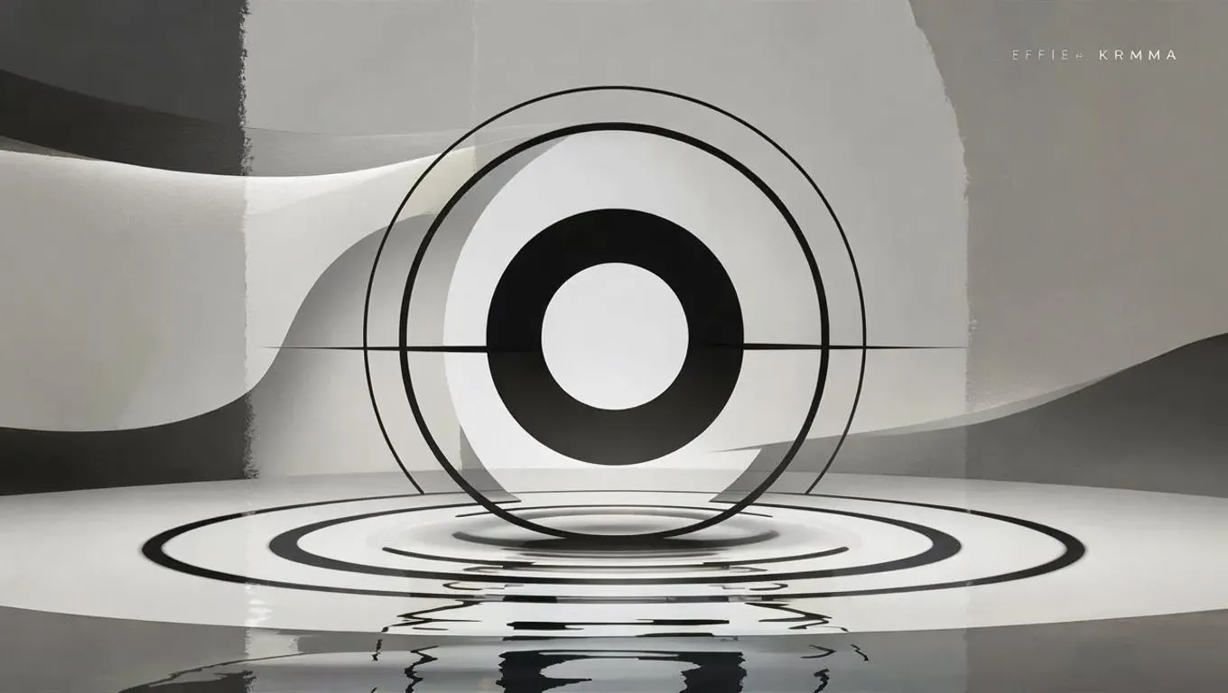 Generate minimalist karma artwork with AI: a serene, unbroken circle in neutral tones embodies the eternal cycle of cause and effect. Subtle gradients and concentric ripples evoke calm balance, reflecting karma's continuity through clean, reflective design.