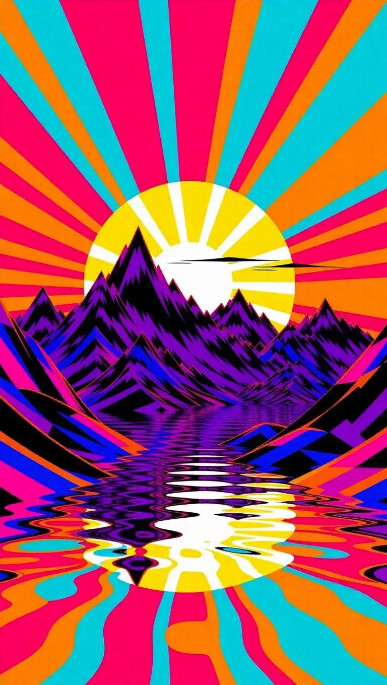Generate vibrant, psychedelic AI art blending entoptic phenomena with sunrise mountain-seascapes. Explore surreal cartoon aesthetics, harsh neon hues, and layered abstract textures. Transform prompts into coated visual experiences, peeling reality's layers through AI-powered creative tools for striking digital compositions.