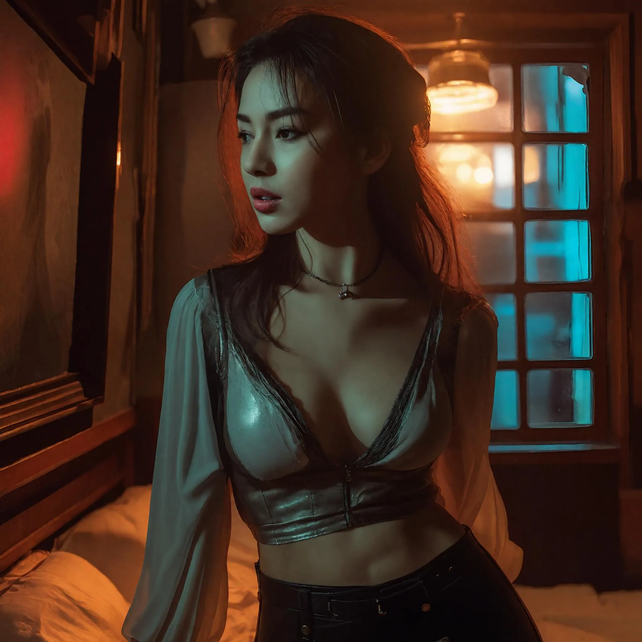 A woman standing in the same setting and wearing the same clothes as before, but this time viewed from behind. The perspective is a medium shot, capturing her full figure with attention to the details of her attire and the surrounding environment. The lighting remains consistent with the previous scene, casting soft, natural shadows that highlight the textures of her clothing and the background. The overall composition follows the rule of thirds, placing her slightly off-center for a dynamic and engaging visual. The style retains the original's aesthetic, blending realism with a touch of artistic flair.