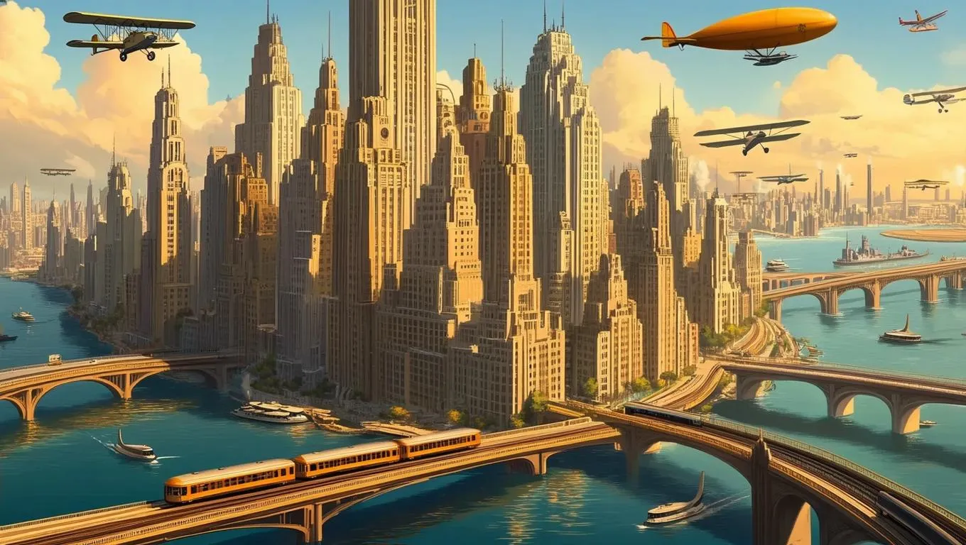 Explore a 1920s-1930s Art Deco cityscape on island clusters, blending skyscrapers, elevated railways, and iron bridges. Vintage seaplanes, zeppelins, and biplanes fill skies and waters, inspired by Cape Suzette (Talespin) and Porco Rosso. Realistic retro aircraft, Art Nouveau details, and oceanic highways create a seamless fusion of history and aviation fantasy with vivago.ai's AI image tools.