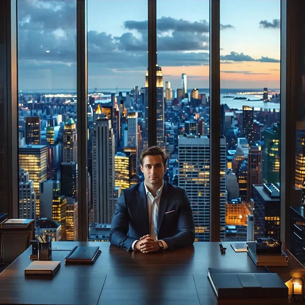 Generate a professional AI image of a blue-eyed man at a sleek office desk with NYC skyline backdrop. Vivago.ai crafts realistic corporate visuals using text prompts and AI effects for polished, high-quality photo results. Ideal for branding and professional content creation.