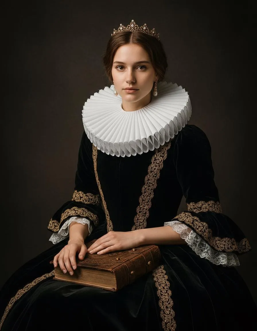 Transform the reference people into a realistic Baroque-inspired studio photoshoot. Preserve the child’s facial features, hairstyle, and body shape from the reference image. The people is dressed in an elaborate black gown with rich textures, a dramatic pleated white ruff collar, and pearl earrings. A small crown rests neatly on her head, with hair pulled back in a refined style. She holds a book gently in her lap, posed with a calm and noble expression. The background is a dark, textured studio backdrop with soft, controlled lighting that highlights the child’s face and clothing. The overall effect must look like a high-quality professional photograph — sharp details, natural skin texture, and realistic fabric — elegant and majestic, without looking like a painting.