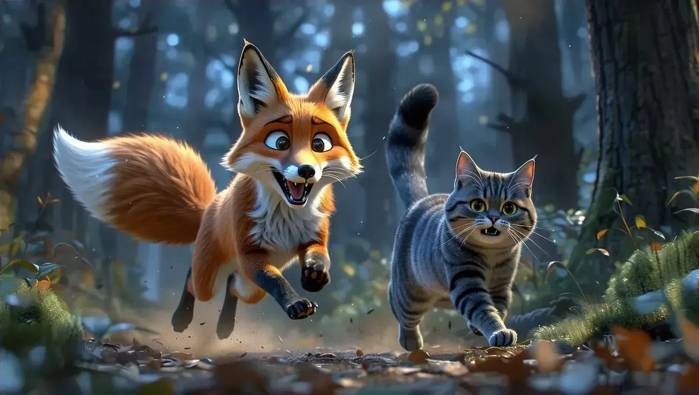 Create a whimsical Pixar-style scene with AI: a frightened fox flees through a mystical nighttime forest edge, pursued by a chubby gray cat. Perfect for animation lovers seeking vivid, playful AI-generated visuals. Craft professional-grade storytelling moments with vivago.ai's dynamic tools.